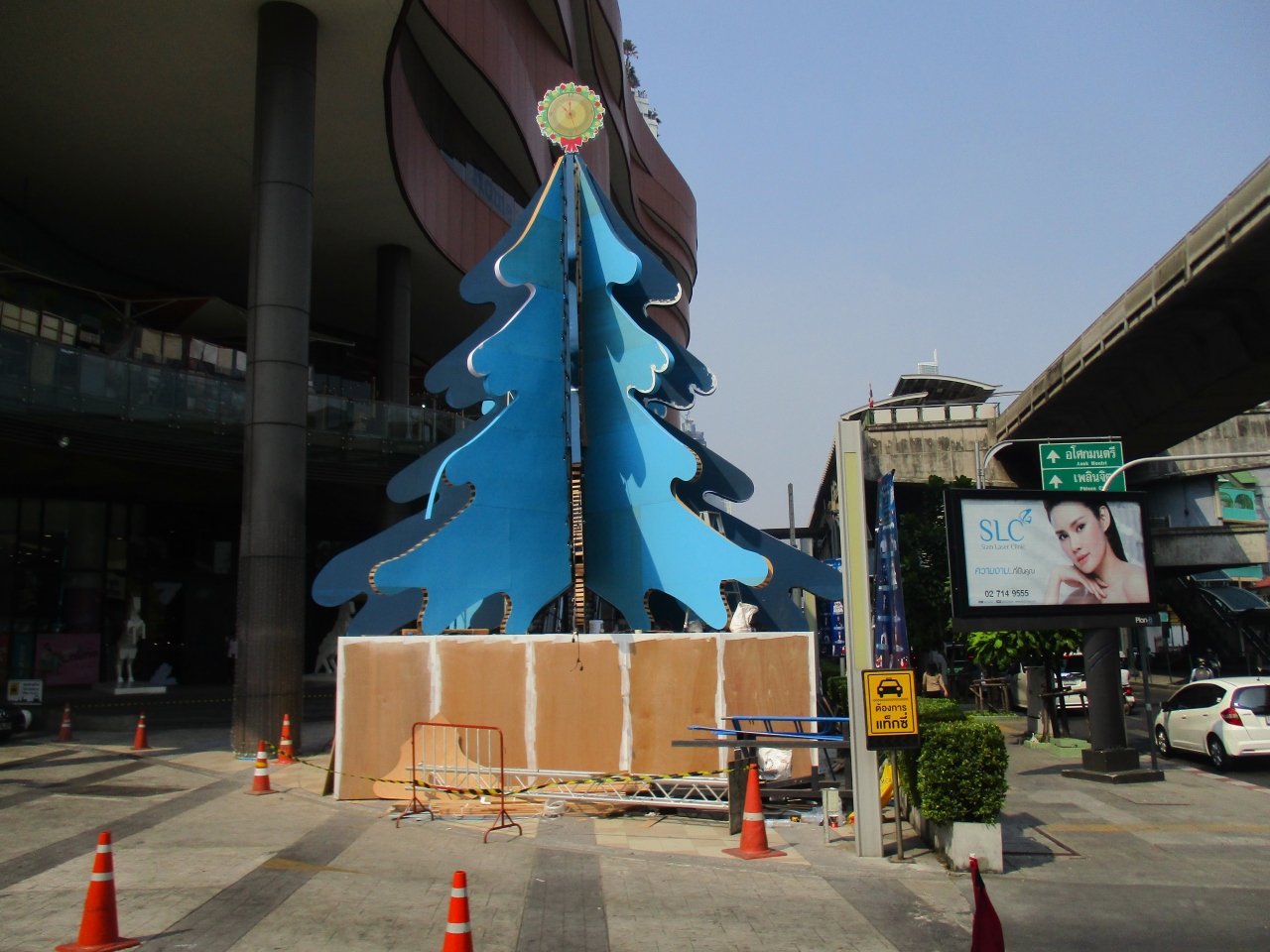 クリスマスシーズンのエカマイ駅を利用しました。駅前に大きいクリスマスツリーが飾られていました。ツリーはBTSスクンビット線の高架と同じくらいの高さでした。夕方頃から点灯しはじめ、夜になるときれいな電飾になりました。