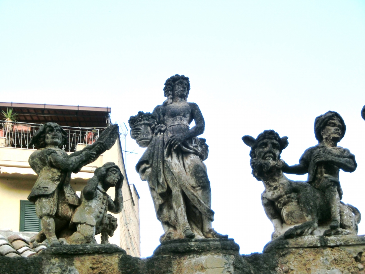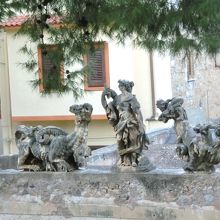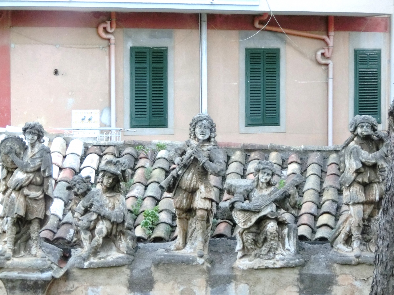 現在の入口はウンベルト1世通りの端にあり、頭の上に手を置いたとぼけた表情の男性像が出迎えてくれます。パラゴニア屋敷を取り巻く塀の上に、ドラゴンをはじめ、様々なモンスターの像がずらりと立ち並び、今も屋敷を守っています。