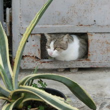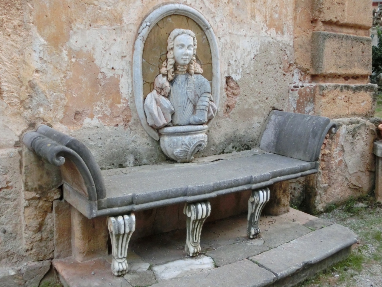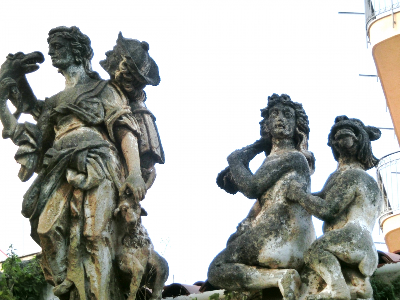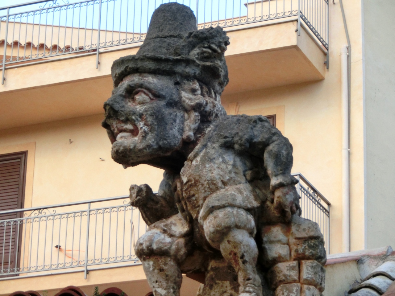 パレルモから電車で15分のバゲリア駅下車。駅から南へ歩き、パラゴニア通りに入ってどんどん歩いていくと、かつての正面玄関、今は裏門に突き当たります。裏門のそばの家に猫ドアがあり、ドアから頭だけ出した猫が通りを鋭く見張っていました。裏門には5つ目のおじさんの像と、人間と動物が合体したような頭を持つ像があります。