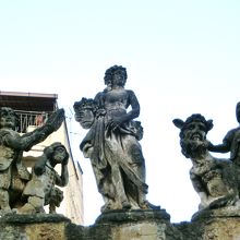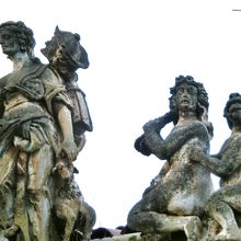 鏡の間の壁では、代々のご先祖様の浮彫が今にも壁から飛び出してきそうな雰囲気で「ようこそ!」と歓迎してくれます。天井がすべて鏡になっていて、かつて舞踏会が行われた時などには、天井にもくるくるとダンスを楽しむ人々の姿が映り、鏡の国のアリスの世界が展開されていたのかもしれません。二階の窓からは、塀の上のモンスターたちが今も、ダンスを盛り上げるために音楽を演奏している様子が眺められます。