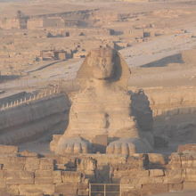 Hayat Pyramids View Hotel のKFCの真裏当りにある4階の部屋からピラミッドの方を見ると、スフィンクスと目が合ってしまいました。高さ20mというので、目のあたりは16~17mで、大体同じ高さです。多分、その頃、KFCは無かったので、水平方向を見るように作ったのだと思います。