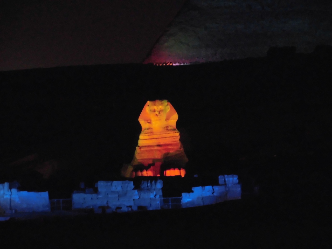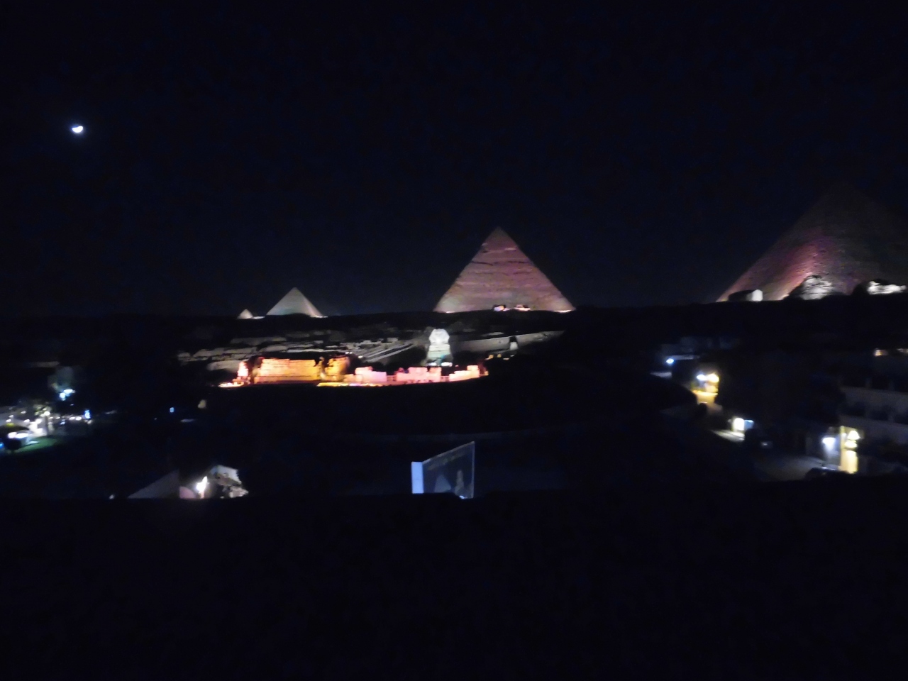 宿泊していたHayat Pyramids View Hotelのテラスレストランから見ていました。オーナーが400ポンド(約2500円)だけど宿泊者ならタダで見れるよ、と笑っていました。外部の人も食事を取りながら、正面から見れます。