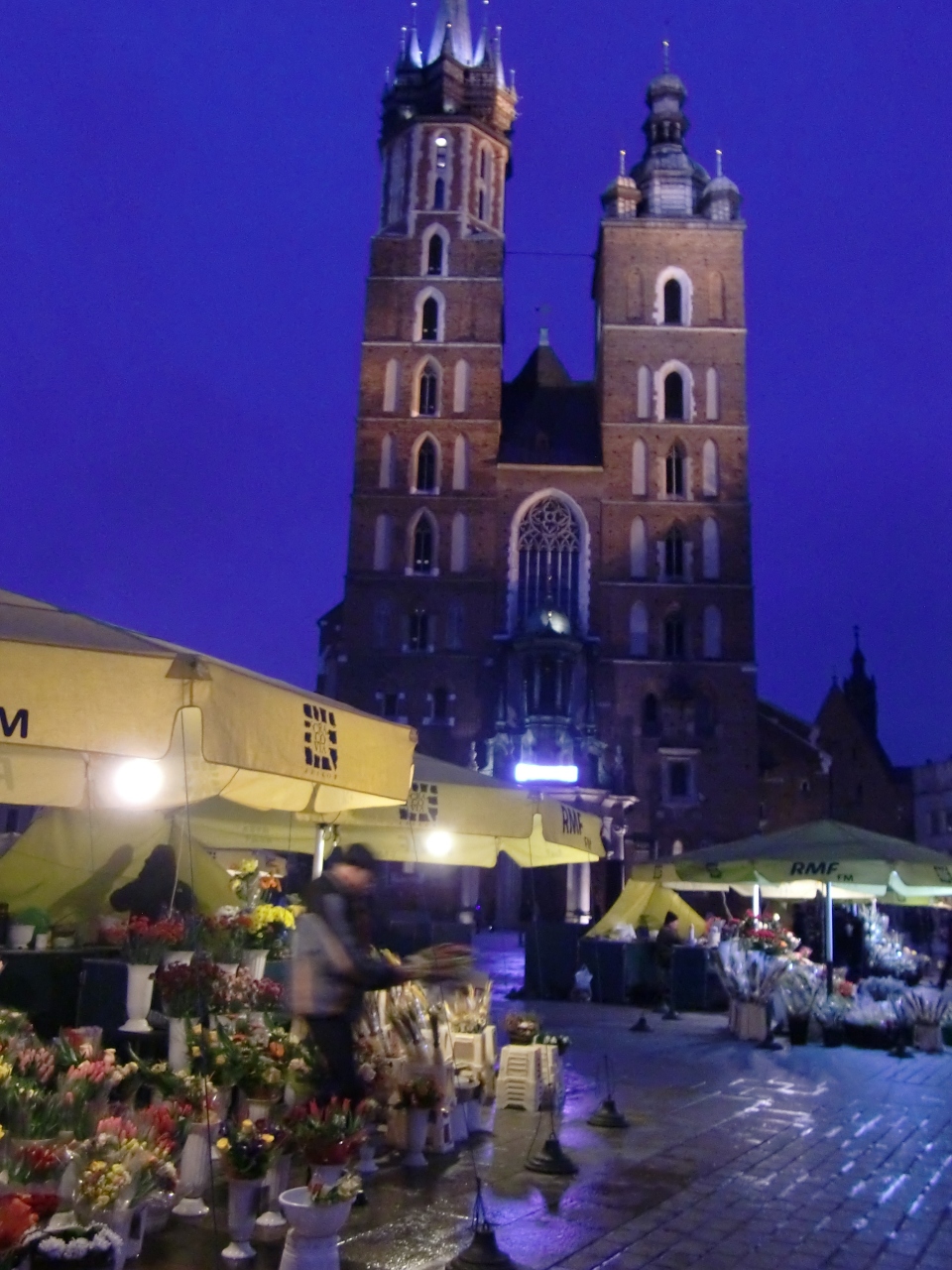 クラクフ旧市街地の中央にある「中央広場」。周囲には聖マリア教会や織物会館、またレストランや有名なチョコレートカフェなどがあり、観光の中心となる場所です。広場ではフラワーマーケットが出店しており、もしアウシュビッツ強制収容所に行かれる方がいらっしゃれば、ぜひここで白い花を買っていくことをお勧めします。