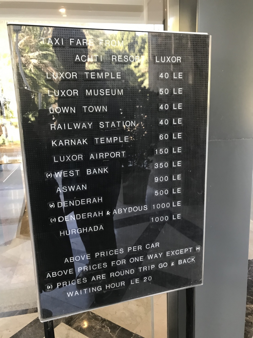 いろんな国のタクシーに乗りましたが、非常にわかりやすく面倒な国です。未だにUBERやCareemが使えないのも納得。街がクレジットカードに対応していない上、お釣りを出さない街、お釣りがない街とでもいうのでしょうか?おそらく街ぐるみで観光客から稼ぐ街なんでしょう。ここに来てわかったことですが、明瞭価格を提示しているホテルに泊まったことで大体の相場観がわかりました。4キロあたりの移動はエジプト人なら10E£、観光客なら30E£出せば交渉なしで交渉するなら20E£くらいで手を打ってあげましょう。なかなか小銭札、1E£札、5E£札、10E£を見かけないもらえない国なので交渉が難航するのです。なぜならカフェやレストランに行き、小銭をもらうために50E£出し、1E£のコーヒーを飲みたくても49返らず、小さな札がなく、40しかないからお釣りがないと言ってきますからね!お釣りがないと言われて交渉できないので小銭をゲットできれば交渉できます。コーヒーが来たら1E£札を握らせるみたいな、物価的に日本円で120円程なので