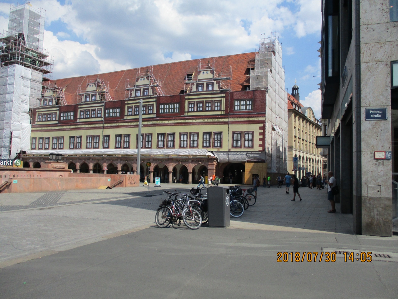 ライプチヒ旧市庁舎(歴史博物館)の西にひろがる広場です。中央駅から、sバーンを使っても行けますが、徒歩でもそれほど時間はかかりません。ドイツ各都市のマルクト広場の中では、かなり広い方だと思います。広場の周囲は、カフェのテラス席などもあり、人々が飲み物を楽しみながらくつろいでいました。