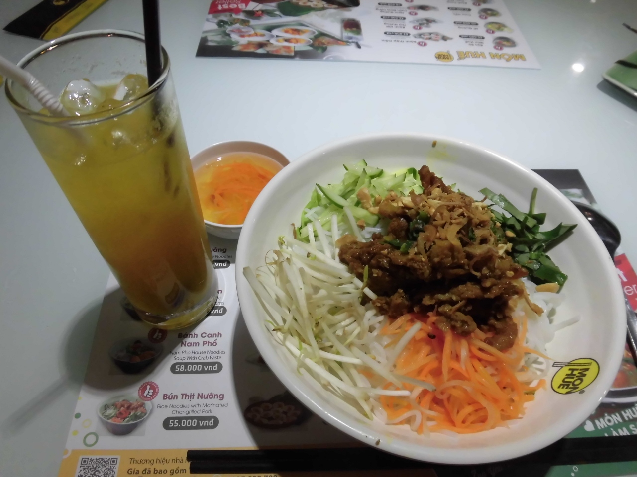 ブン(お米でできた麺)料理などやフルーツ各種ジュースがあり、フードコート並みの安さです。店内は綺麗で、バルコニー席(屋外)もあります。