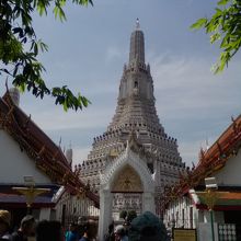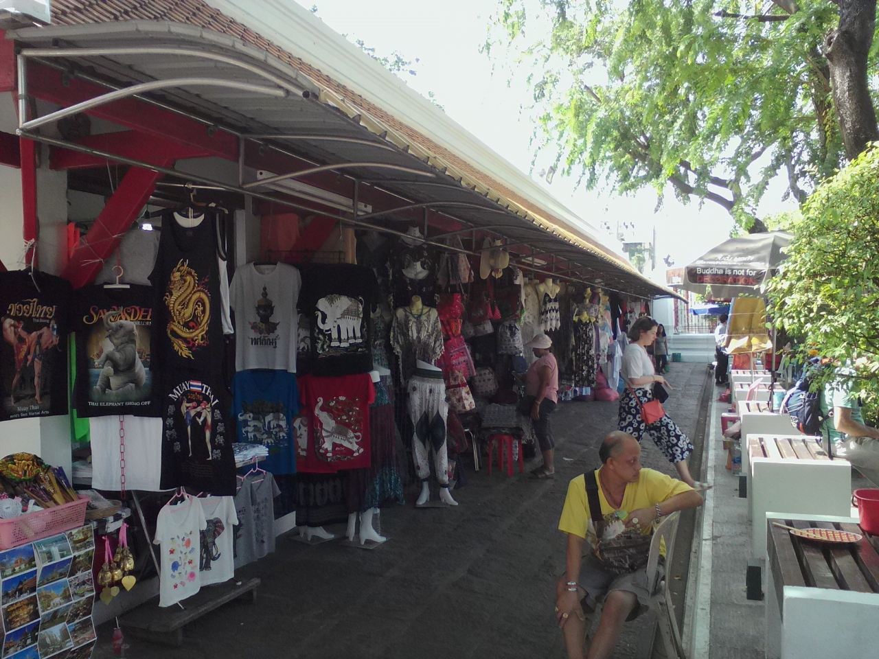 ワットアルン前にある露店の土産物屋です。このエリアは入場料(50B)は必要ありません。バンコクでも有数の観光地にある土産物屋ですから値段はもちろん高いです。わざわざこんなところで市内のどこにでも売っているような土産物を買う必要はまったくないと思いますがパッケージツアーなどのあまり自由度のない旅行者の方は買わざるを得ないかもしれません。多少のディスカウントはしてくれるかもしれないので一応交渉はしてみて下さい。土産物屋はさておき、ここからのワットアルンの大仏塔の眺めがとてもいいです。