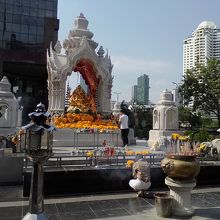 バンコクのど真ん中、伊勢丹デパート前に鎮座しているのはガネーシャとトリムルティーの2体の神様。どちらも金ピカでいかにも御利益がありそうです。ガネーシャは成功、学問、仕事、幸運、商売。トリムルティーは恋愛、健康、仕事、幸運、お金の願いが叶うようです。2つともお参りしておけば最強だと思います。タイ人に混じってお祈りしてはどうでしょうか。