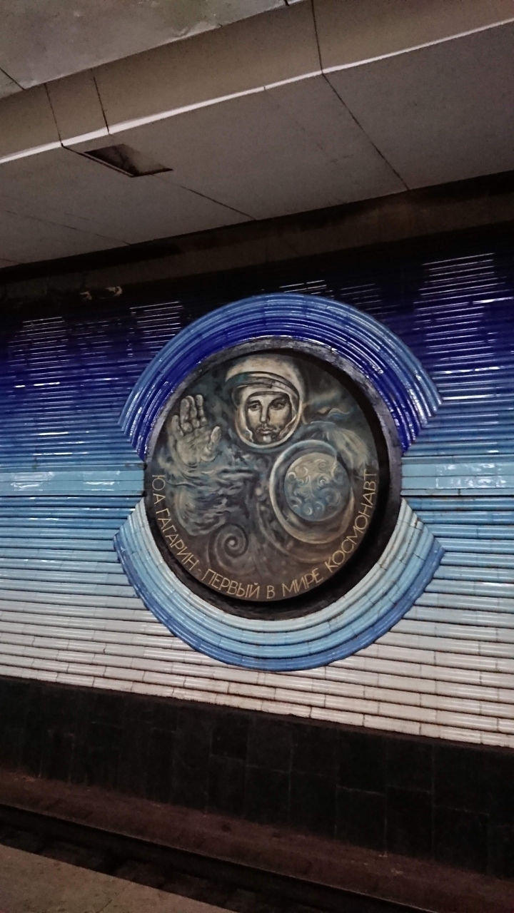 圧巻は「コスモ・ナトゥラル」という駅で、ガガーリン、テレシコワ等の旧ソ連の宇宙飛行士たちのレリーフが彫ってある。(なぜかアリストテレスまであるが。)さすがは世界で初めて宇宙に人間を送った国の末裔である。