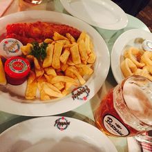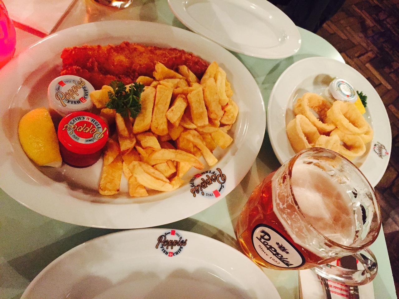 2人でフィッシュ&チップス1皿+小皿で十分なボリュームでした。付け合わせのフライの量も尋常じゃないので、周りの人のお皿を見て注文するといいです。
