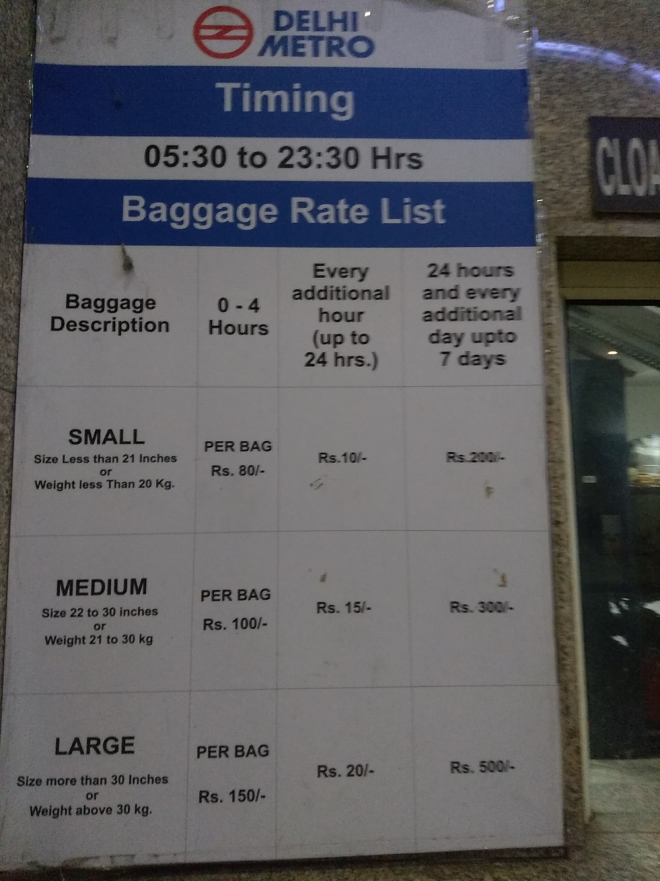 あと、メトロのニューデリー駅には荷物を預けられるcloakroomがあり、私たちは2つのバックパックを預けました。6時間預けて2つで200ルピーでした。荷物の大きさで料金は違います。