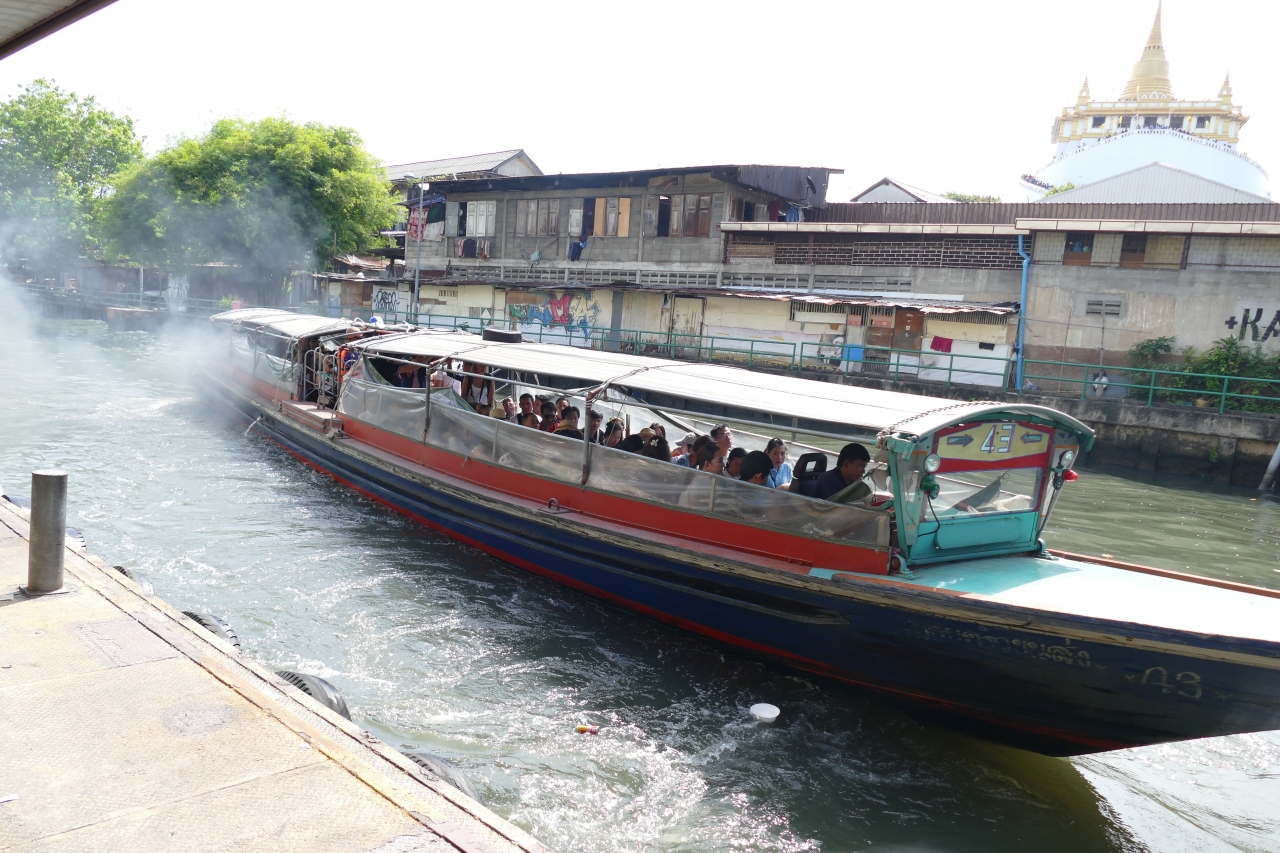 バンコク市民の日常の足で渋滞知らず。私たちは1月1日に利用しました。「黄金の丘」で知られるワット・スラケート(サケット)を見学後、北に徒歩3~4分でパンファー・リラート船着き場に到着。目の前で船を逃しましたが10分足らずで次の船が来ました。