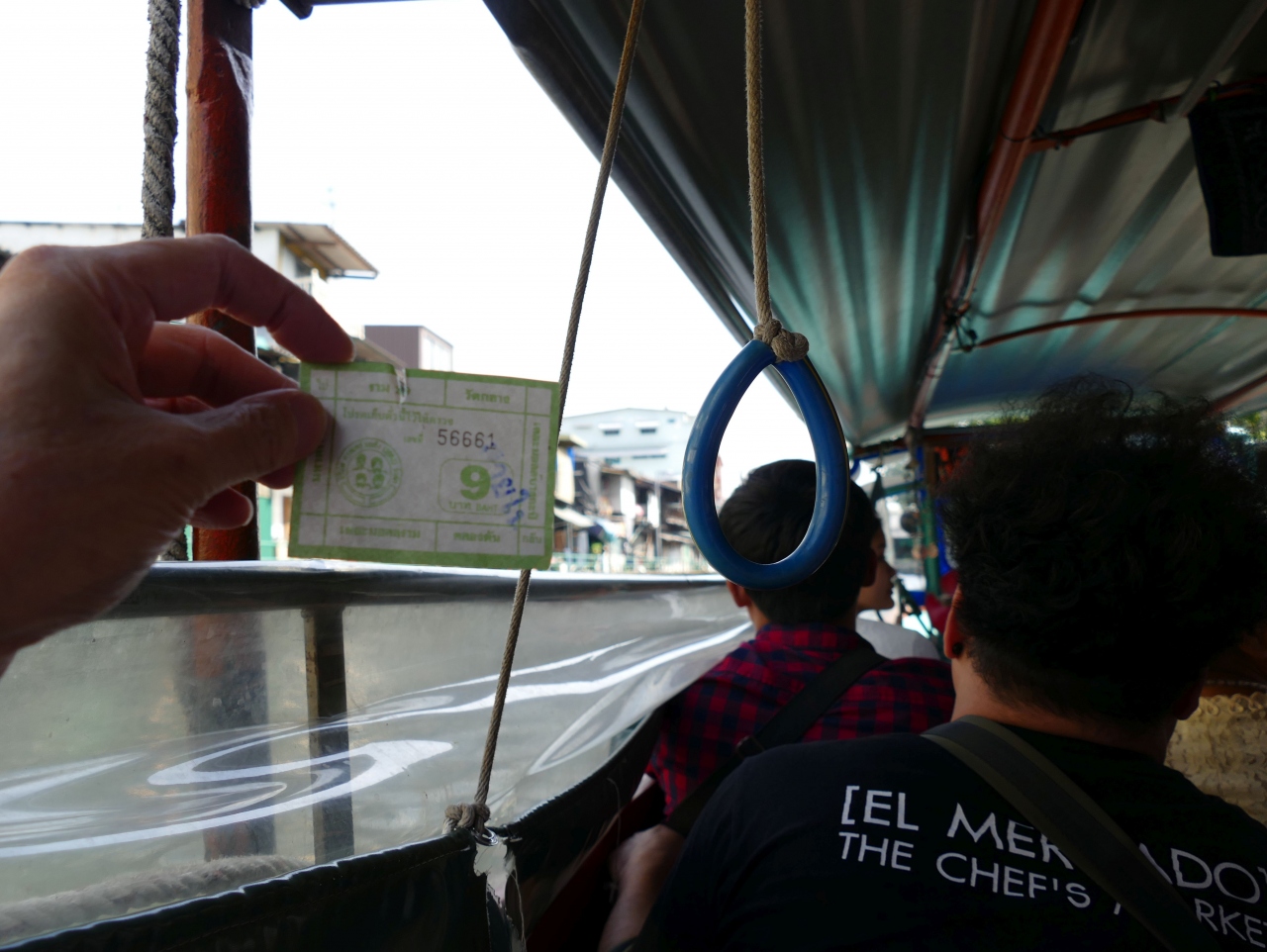 船は満員。バンコク市民8割、観光客2割という感じで私たち以外に日本人はいませんでした。乗車後、車掌に行き先を告げて料金を払う仕組み。四つ目のサパーン・フアチャーン船着き場までの料金は1人9バーツ。運河ボート公式HPには最低10バーツと書いてあったような・・・?