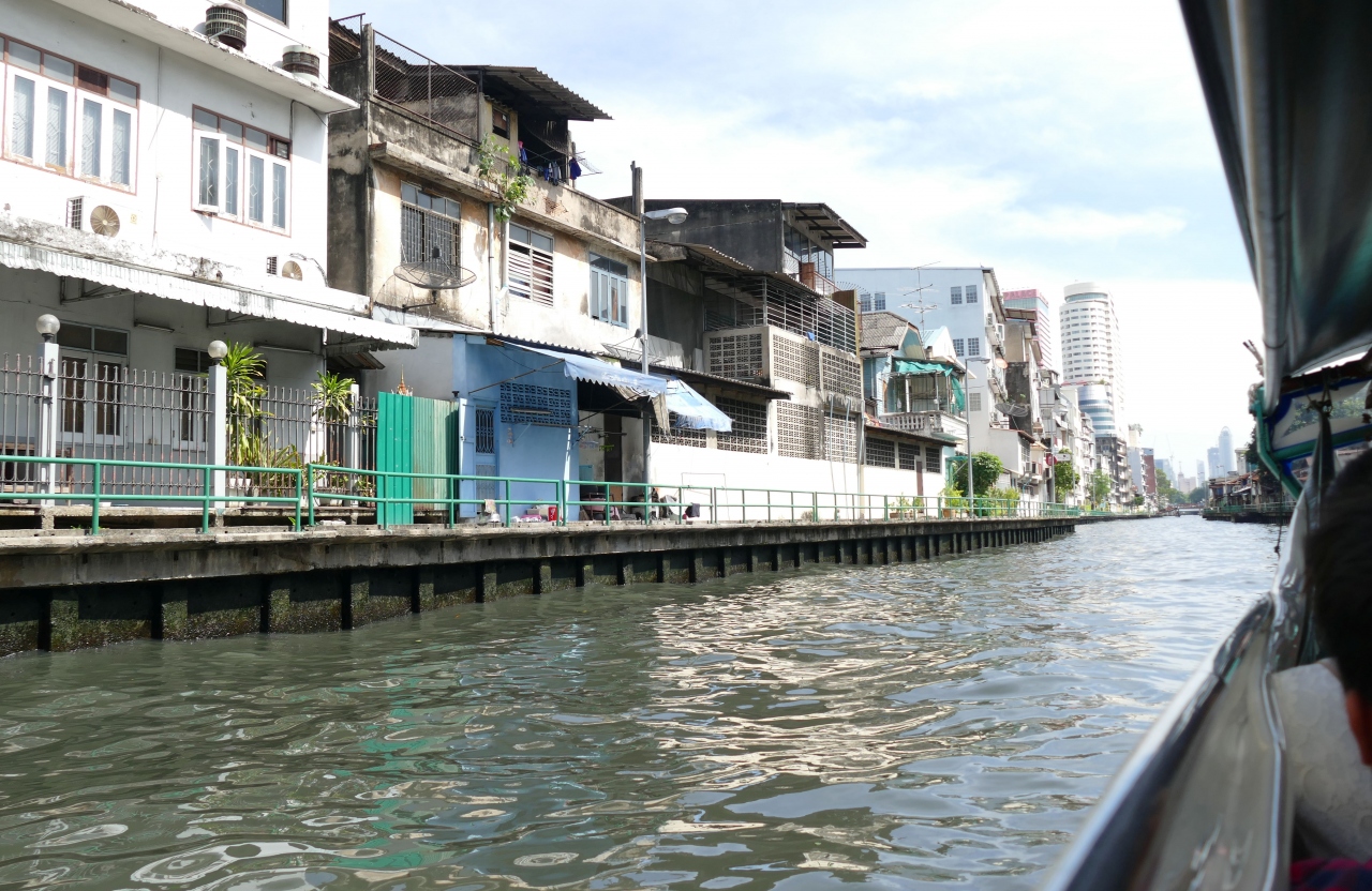 船上からはバンコク庶民の暮らしぶりが垣間見えて楽しいです。掘っ立て小屋で洗濯物が干されていたり、ボート格納庫のある家があったり。