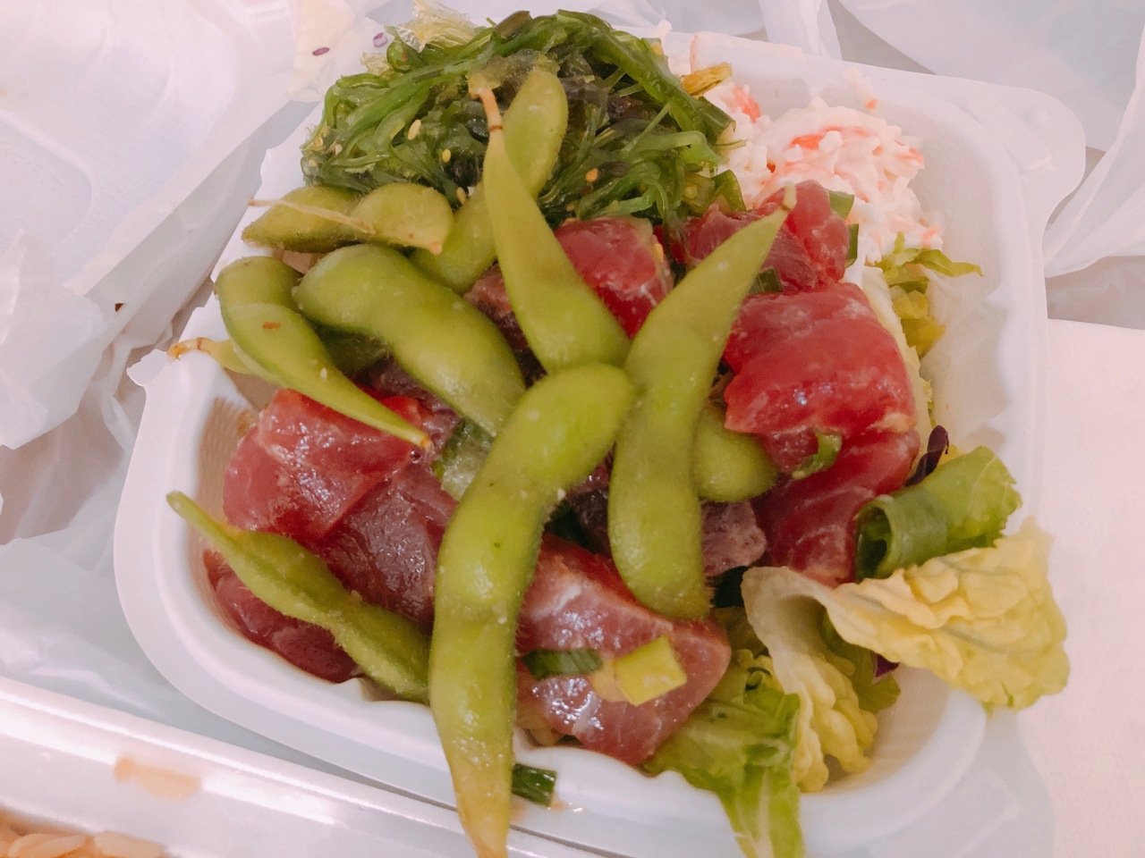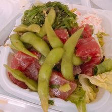 今回は一番小さいサイズ。サラダベースにカニカマトッピング。マグロにポン酢ソース。枝豆と海藻のナムルみたいなやつ(ゴマ油風味っぽい)を選んでみた。