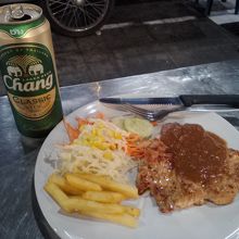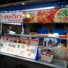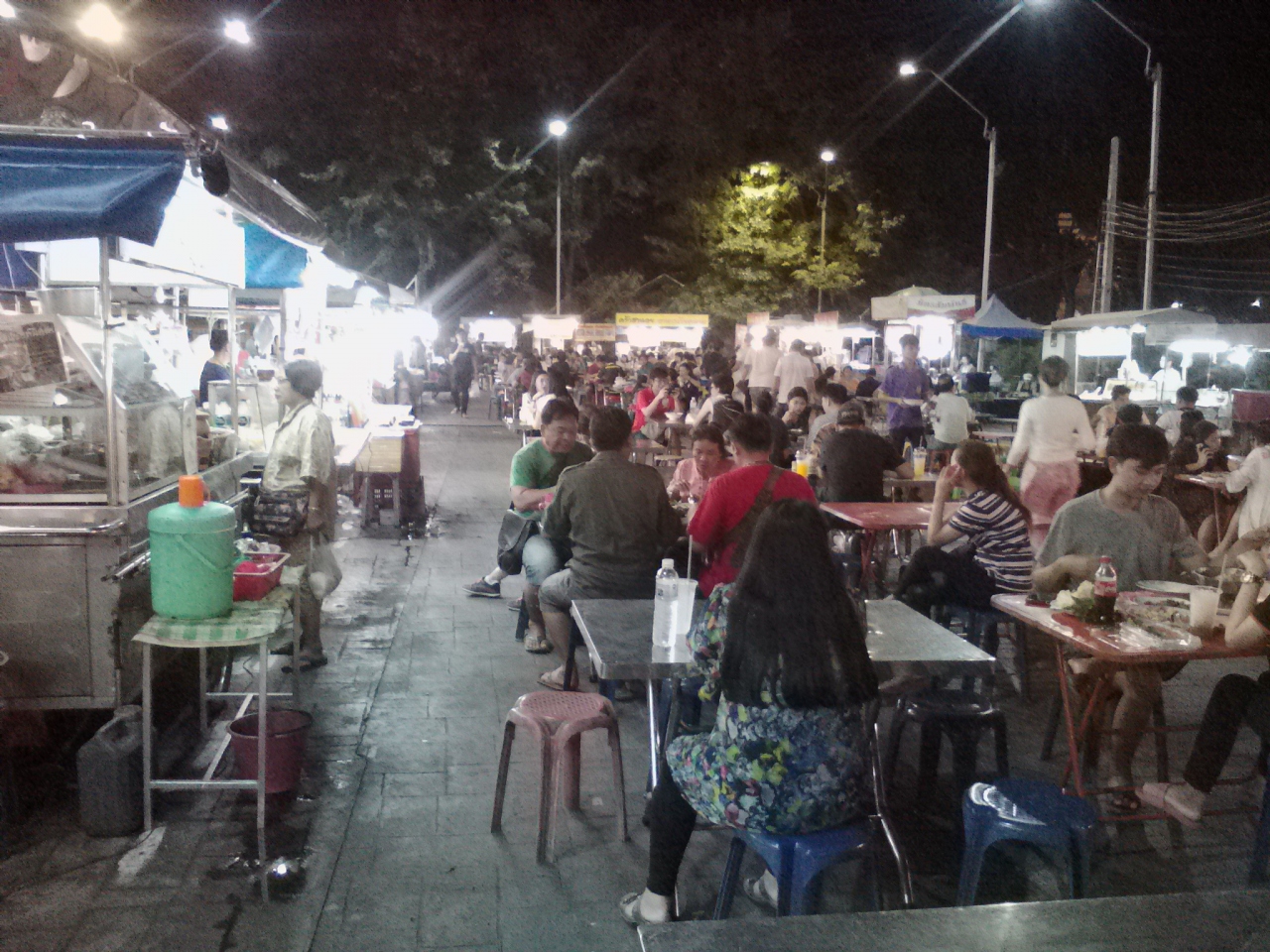 トゥン シー ムアン公園の南側で毎日開かれるフードナイトマーケットです。決してツーリスト用ではないのですが、なぜかローカル感があまり感じられない…。値段が高いからでしょうか。最低でも40,50Bはかかります。40Bも出してカオパットなんか食べるのはアホらしいのでどうせならということでステーキを食べることに。ポークステーキ グレイビーソース(55B)をチョイス。値段が値段なのでなんちゃっての部類に入ると思いますが味はそこそこでコスパ的には悪くないかなと。ビールは道路の向かいにあるセブンイレブンかテスコロータスで買えます。