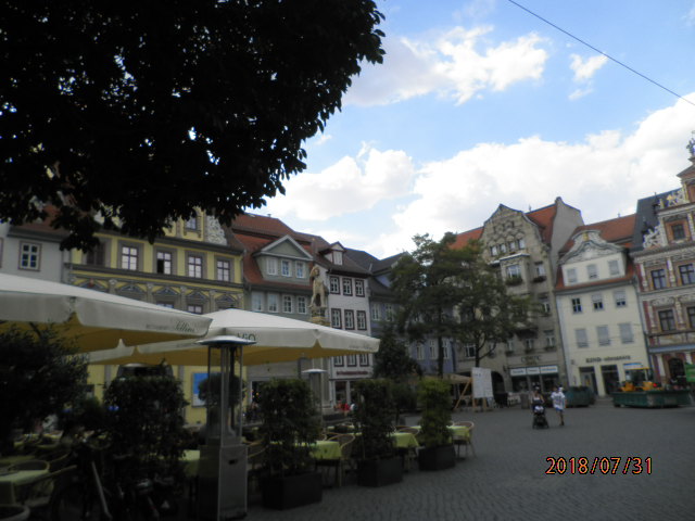 エアフルトの市庁舎前にある広場です。フィッシュマルクトと名付けられているので、魚を売る市場が時々たつのか、あるいはかつてそこに魚市場があったのかわかりませんが、少なくとも私が訪れたときには、それらしきものは見当たりませんでした。広場の中央にローラント像がたち、広場の周囲には、凝った装飾を施した建物が並んでいました。