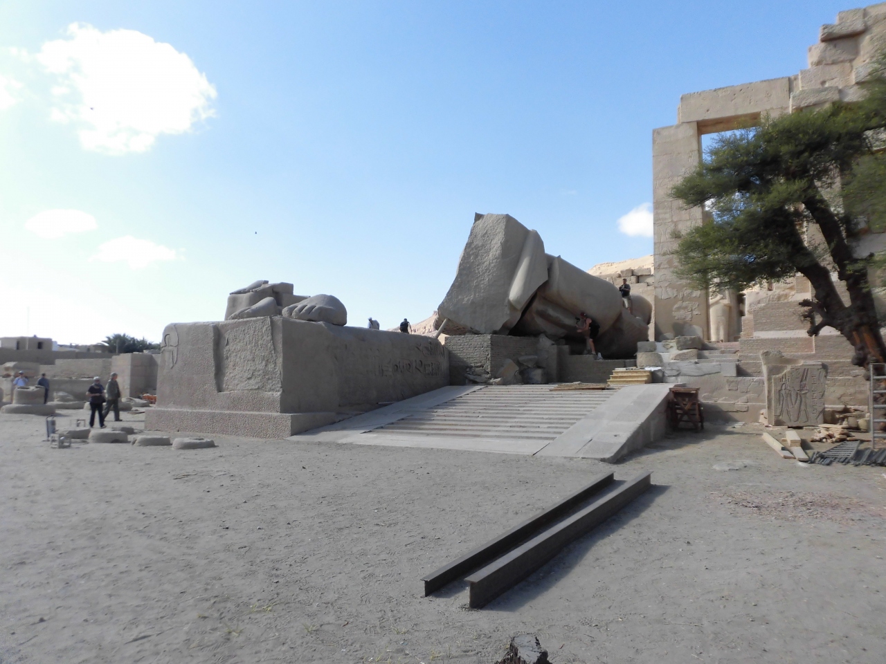 貴族の墓のすぐ近くです。大きなラムセス2世の像が倒れて転がっています。反対側の4体の像は首から上が切られて無いです。ひどい事するなと思ったら、一つは大英博物館にあるそうです。やはり。