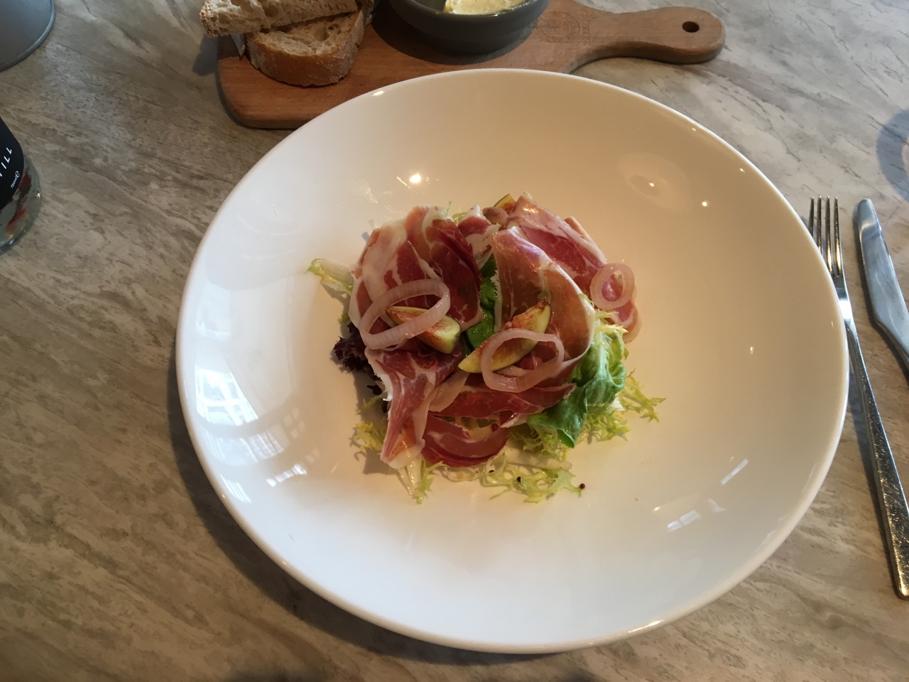 たっぷりのハムと無花果が乗ったサラダとダックレッグのワインソース、デザートはメレンゲをチョイス。どれも美味しくいただきましたが、特にデザートのメレンゲは最高!