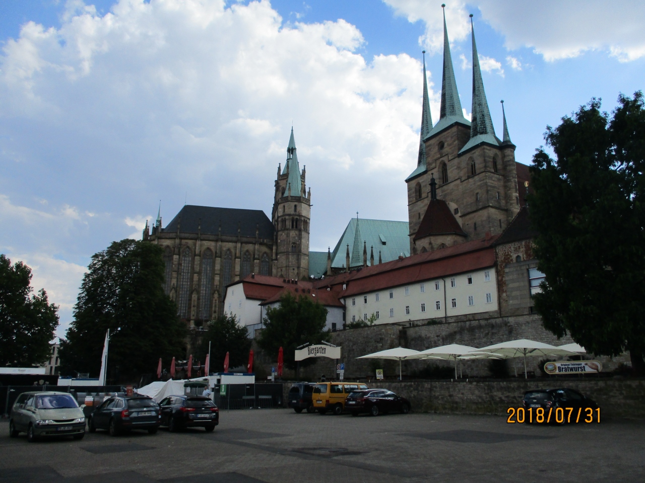 エアフルト中央駅から徒歩で市街地を抜け、約30分かけて到着しました。広場からは、正面の小高い丘(ドームベルク)のうえに、大聖堂とセヴェリ教会を望むことができ、とても絵になる光景でした。広場には、屋台がでており、また、何かのイベントの準備も進められていました。
