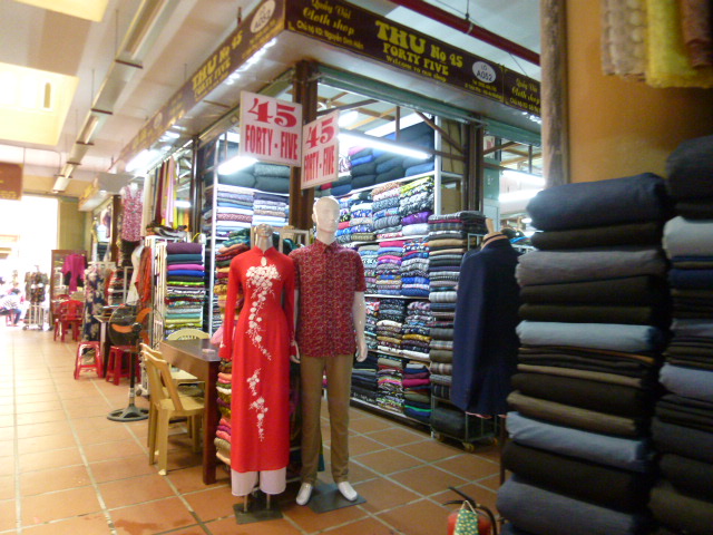 世界遺産ホイアンを訪問してきました。旧市街地の中心となるメインストリートに多くの見どころがありますがその東方向の奥にはホイアン市場があってその隣にこの「ホイアン 洋服市場」はあります。布市場とも言われていますよ。屋内型の市場には多くの店舗が所狭しと並んでいます。殆どが布屋さんでお好みの生地から選ぶことができ裁縫もしてくれますしオーダーメイドも出来るようです。写真を見てください奇抜で色彩豊かなデザインでしょう。今回は拝見するだけでしたが次回は考えちゃうわ。。。