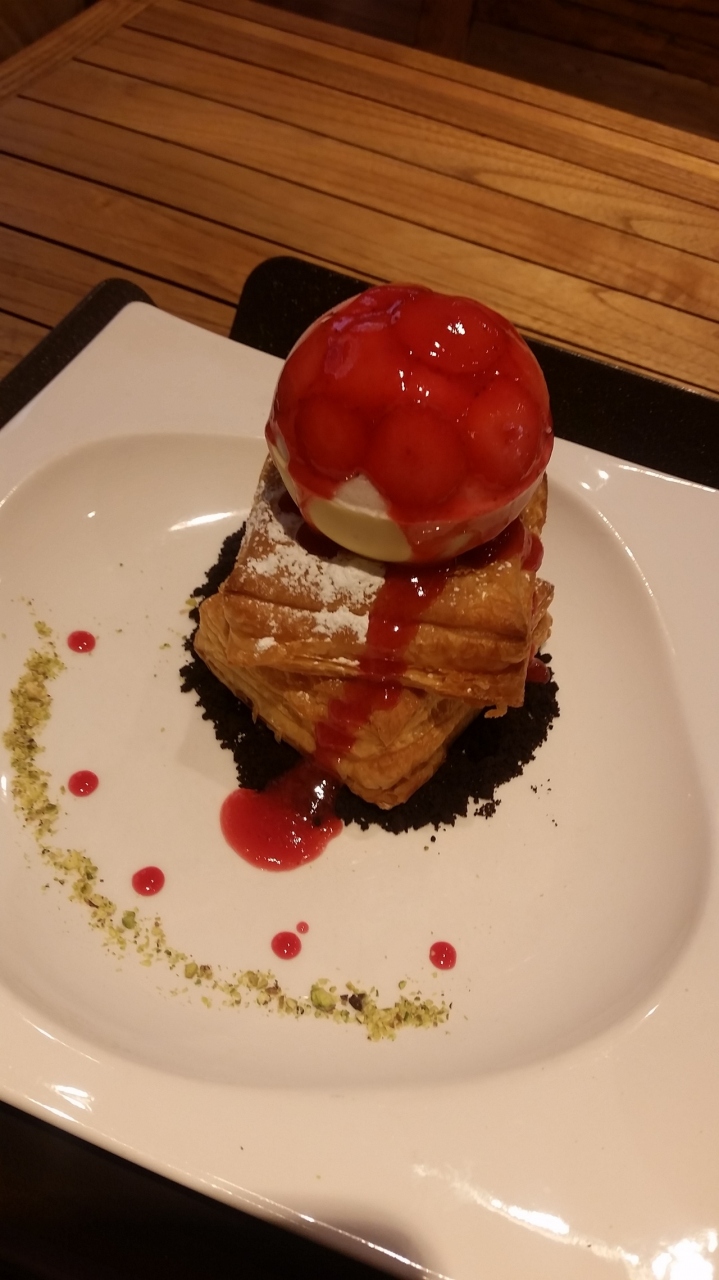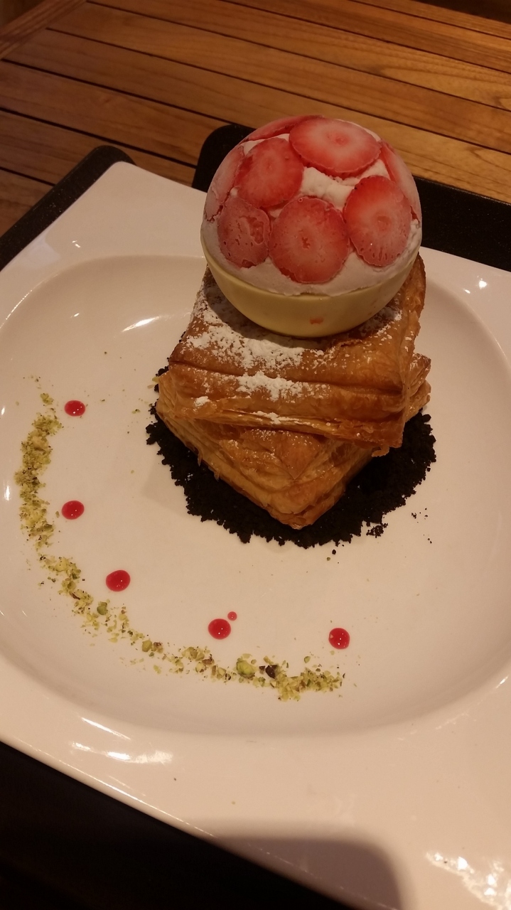 頼んだスイーツは、見た目もかわいく、あつあつのソースをかけて食べるアイスとパイ生地が美味しかったです。カフェに迷ったらまたいくと思います。