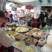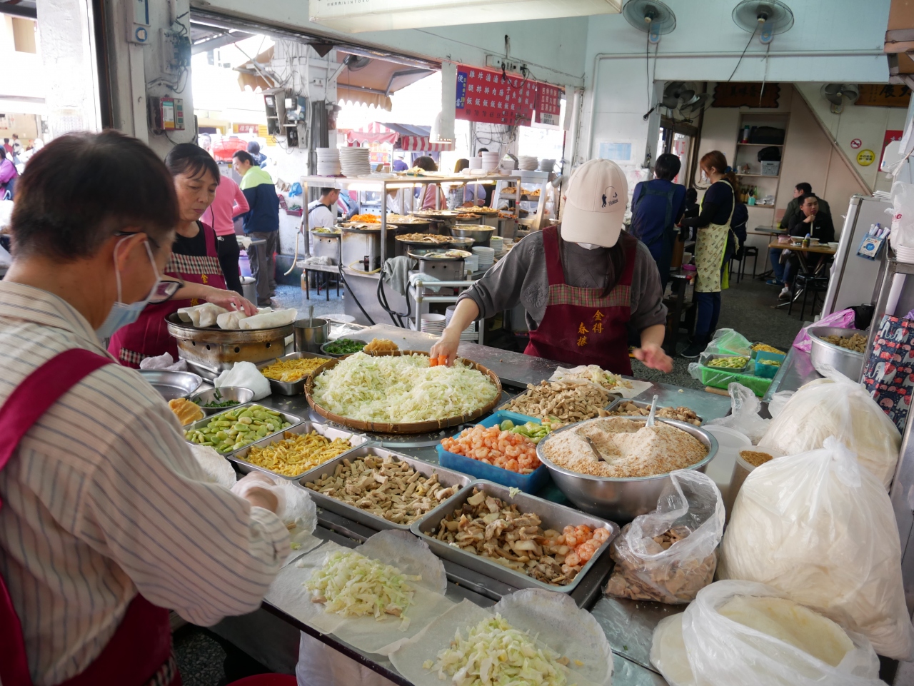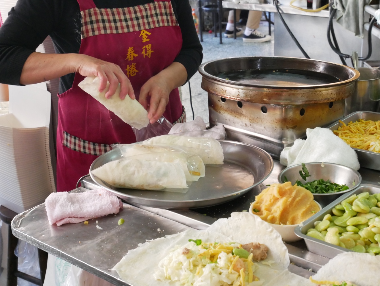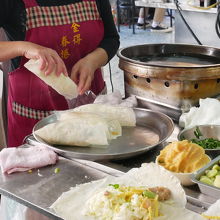 クレープ記事にキャベツのどの野菜やエビなどをたっぷりと巻いた春巻き(揚げ物ではありません)。20人近くの行列になっていましたが、店員さんがどんどん巻いていくので回転も早く、待ち時間はあまりありませんでした。