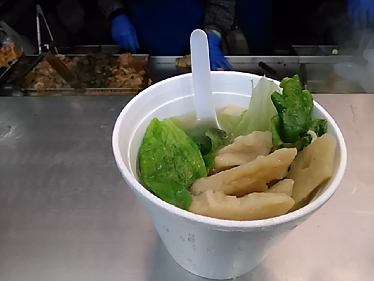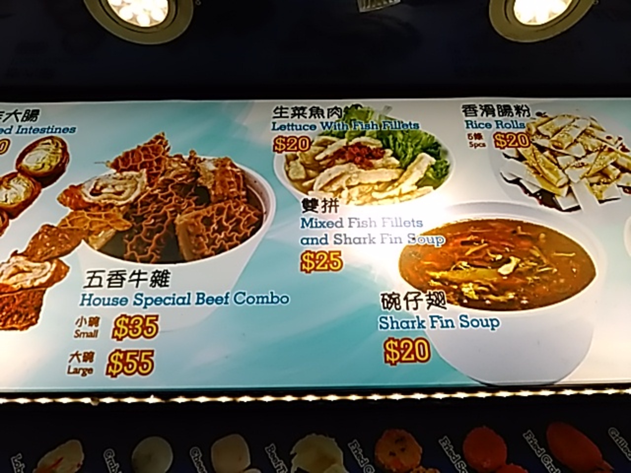 ネイサンロードの一本西側の通りにあります。テイクアウト専門店です。フカヒレスープや煮物、内臓系の串もの等の軽食の他に、フルーツジュースを扱っています。店の周辺は凄い人だかりです。今回は、よくわからないまま頼んで出てきたのは日本のおでんのような食べ物20ドル(300円)でした。あっさり味でした。