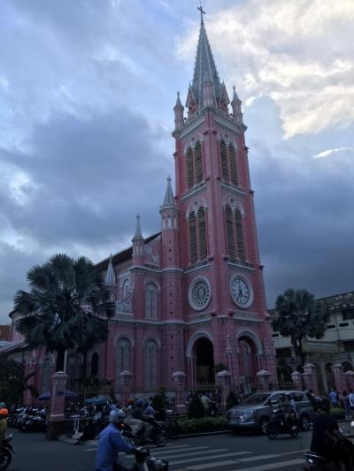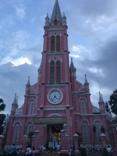ゆっくりと歩いて向かいました、ピンクの外観が非常に目立つ教会でした。