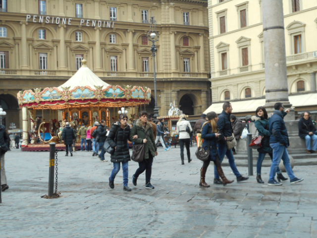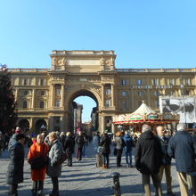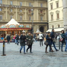ドゥーモ広場の南に位置した門が在る広場にメリーゴーランドが在り、その周囲にはカフェ、レストラン、ブランド店、商店が在り、市民の憩いの場になっていますし、観光客も