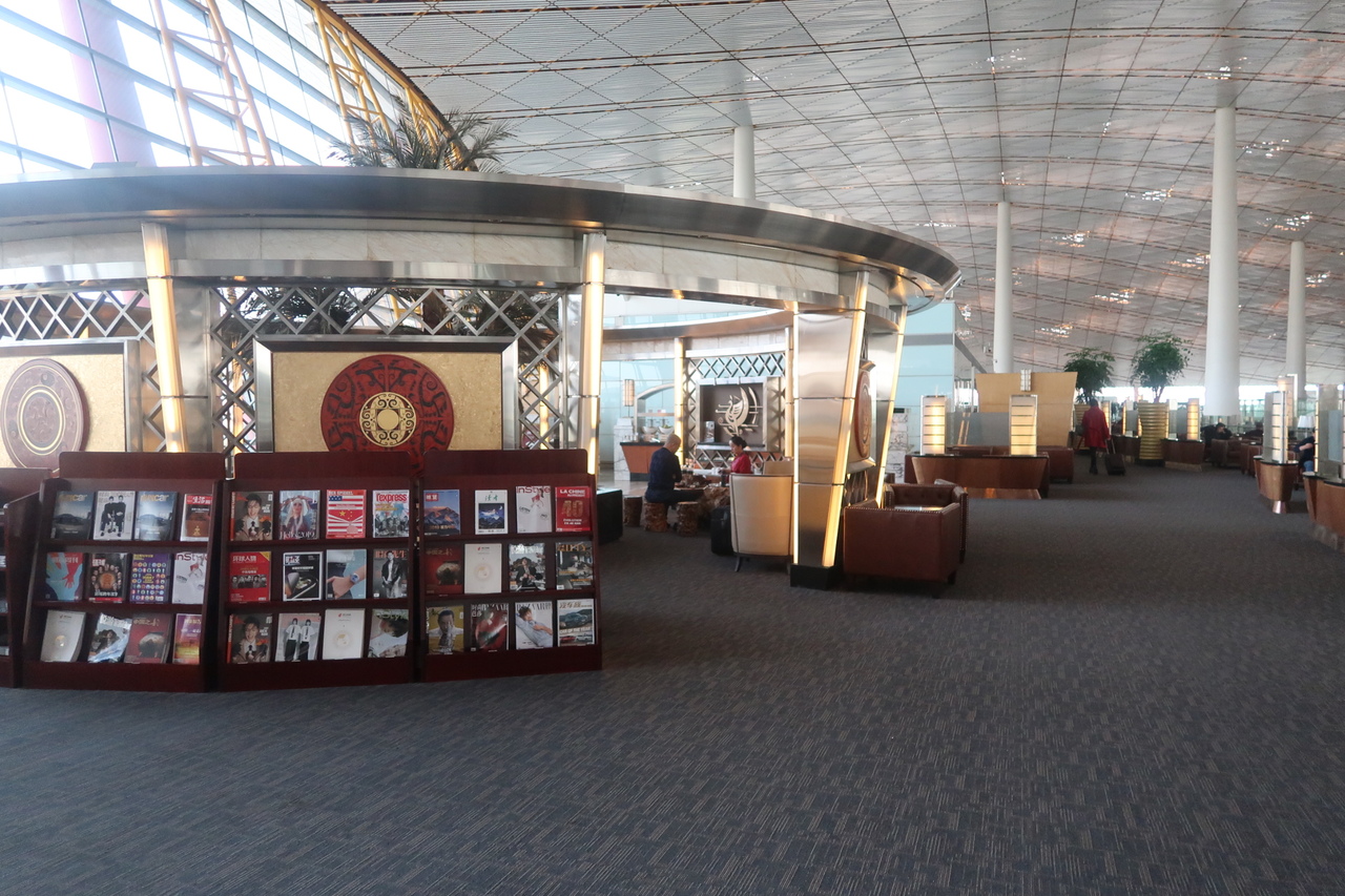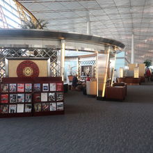 入口で搭乗券のチェックがありますが、ビジネスクラスのチケットでも何も言われませんでした。内部は高級感はそれほどありませんが、奥に食事ができる場所と、それとは別にデザートと飲み物のカウンターが3箇所ほどありました。コンセントはユニバーサル式で日本のプラグがそのままつかえました。