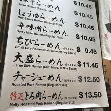 スープはしお、しょうゆ、みそ、辛味噌、それぞれチャーシュー麺、特選とろ肉チャーシュー麺もある。