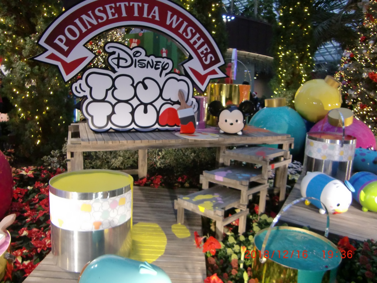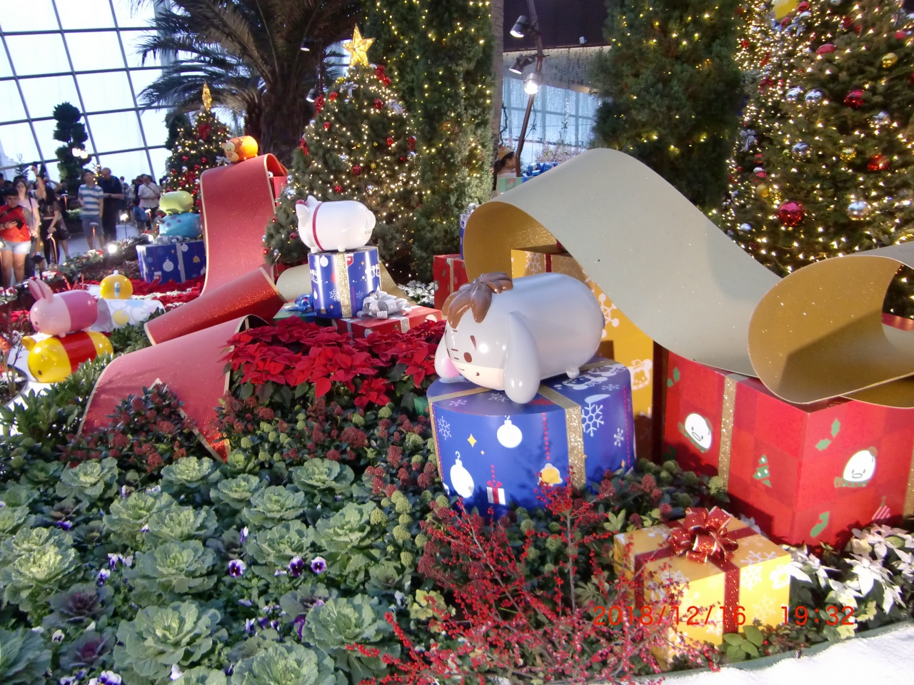 ガーデンズバイザベイに入場する前から、かなりの雨が降っていました。そこで、室内施設のフラワードームへ直行。雨宿りも兼ねてでしょう、沢山の人で溢れていました。2018年のシンガポール、クリスマスシーズンのテーマがディズニーのようで、オーチャードロードもディズニーのイルミネーションでしたが、フラワードームも!!撮影の行列ができていました。