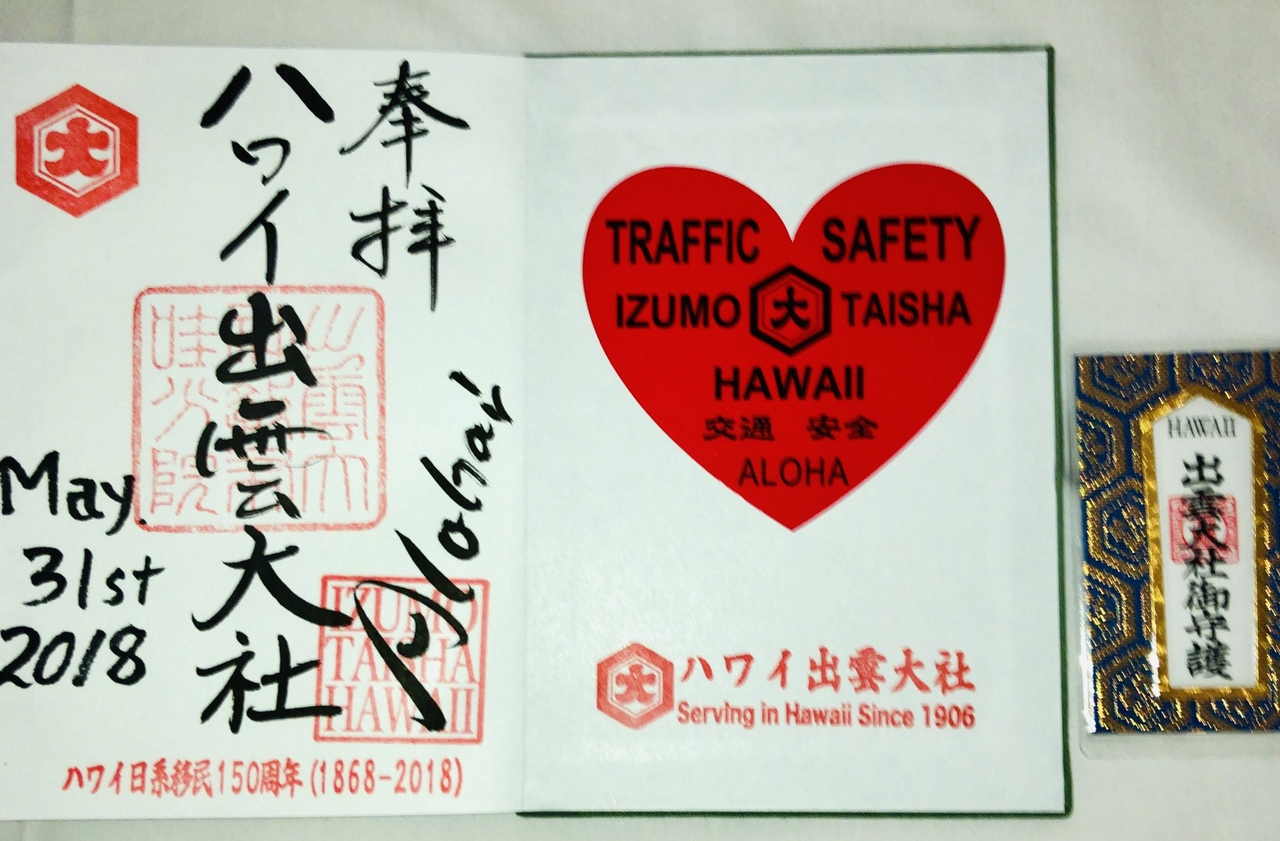 HISのトロリーバスで出雲大社へ。境内はそんなに広くは無いが あちらこちらにハワイアンが感じられる。参拝を済ませて ここで初めて御朱印帳なる物を購入する。御朱印にalohaと書かれているのも嬉しい! 携帯できるカードのお守りも購入。御朱印帳は25ドル、お守りは5ドルだった。