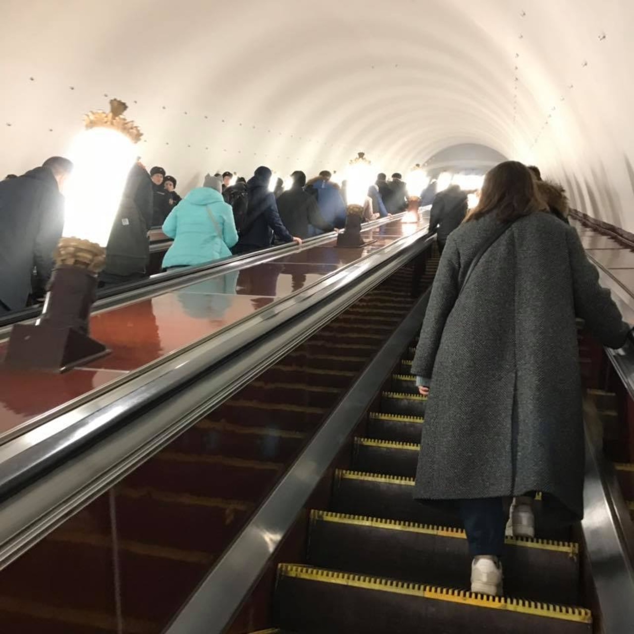 写真撮影は撮影ポイントがあるのでそこから撮影をどうぞ。この美しいプラットホームまでは急で長いエスカレーターを降りなければならない。