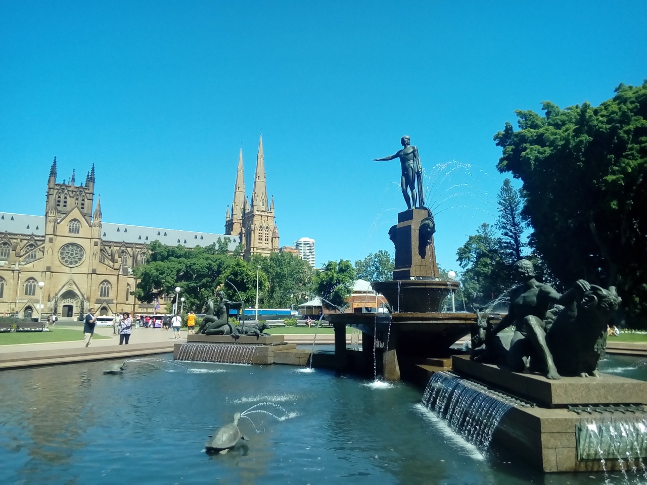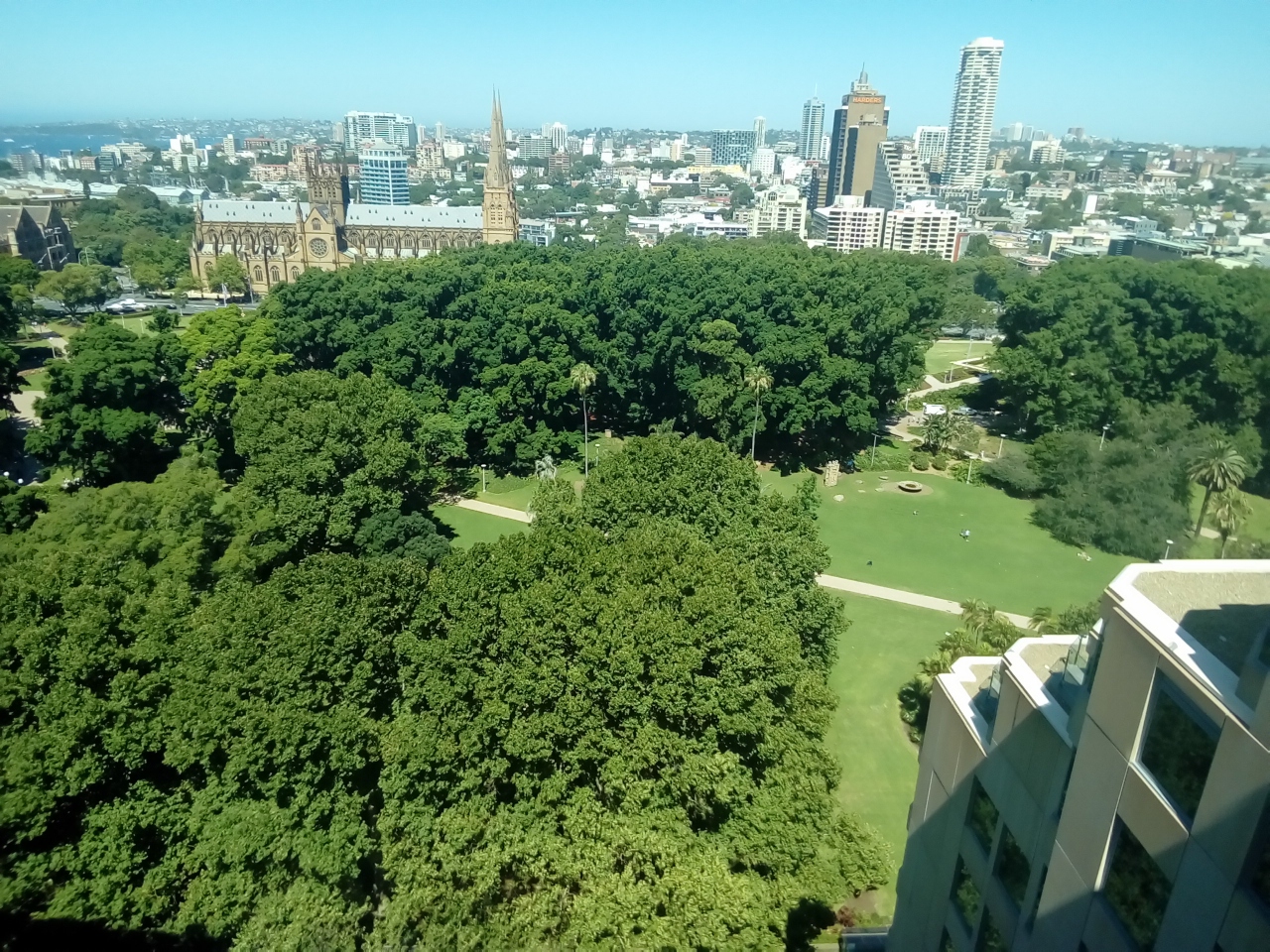 今回はハイドパークの横に位置するホテルに宿泊したため、窓からパークを眺めることができました。真夏のシドニーの中心部にあって緑が多く、犬を散歩させたり休憩する姿が見えました。また、結婚式を挙げたばかりのカップルがウェディングドレスのまま記念撮影をする姿もありました。