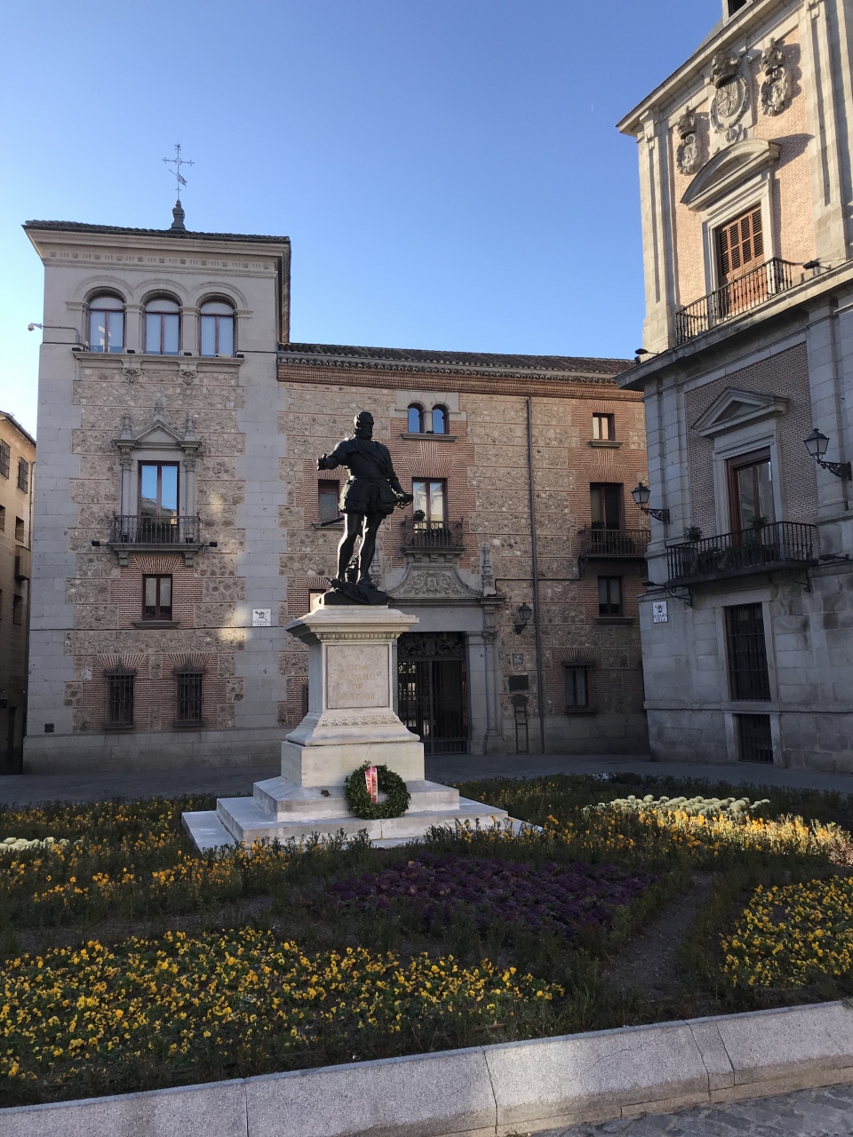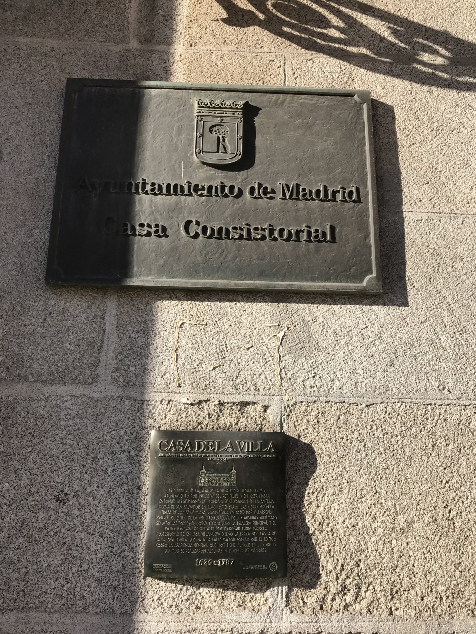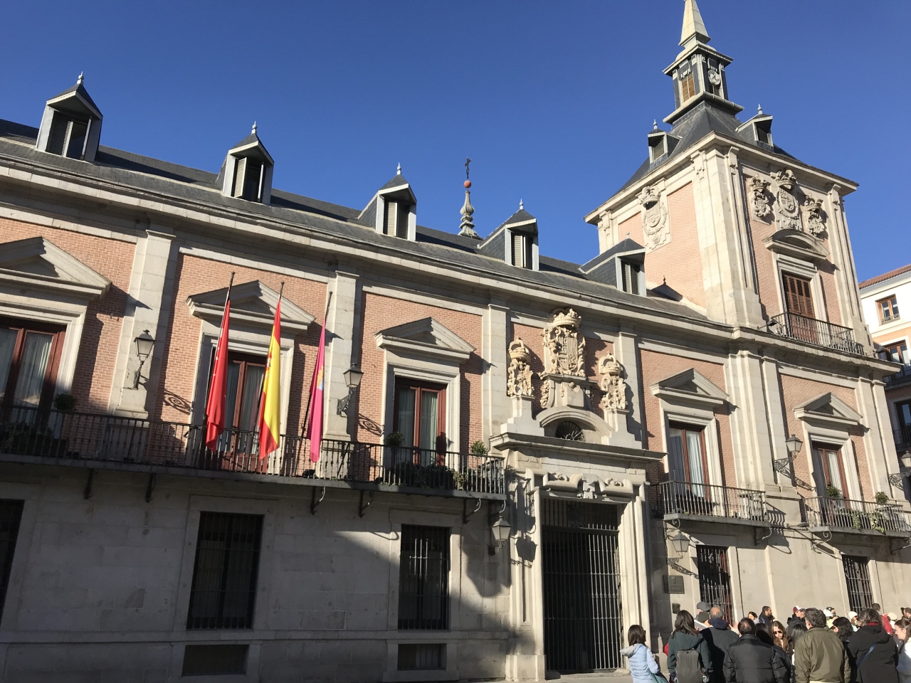 ビリャ広場にある旧市庁舎と市長公舎です。2つの建物は渡り廊下で繋がっています。2007年までは、市庁舎として使われていたそうです。よく見ると、建物には、マドリードの紋章が入っていて、市に関わるものであったことがわかります。マヨール広場と同じような尖塔が印象的な建物でした。