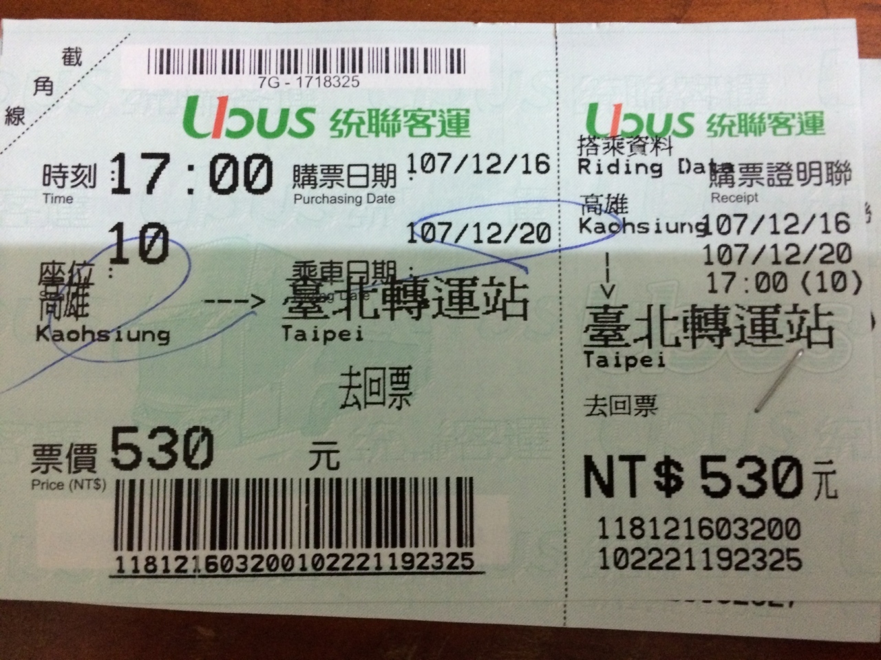 統聯バスに乗って、台北から高雄まで行きました。往復でチケットを買うほうが安いです。月曜日と木曜日はさらに金額が安く、週末はお高めです。椅子に電源がついているので、スマホを充電できます。日本のバスより、この点は良いです