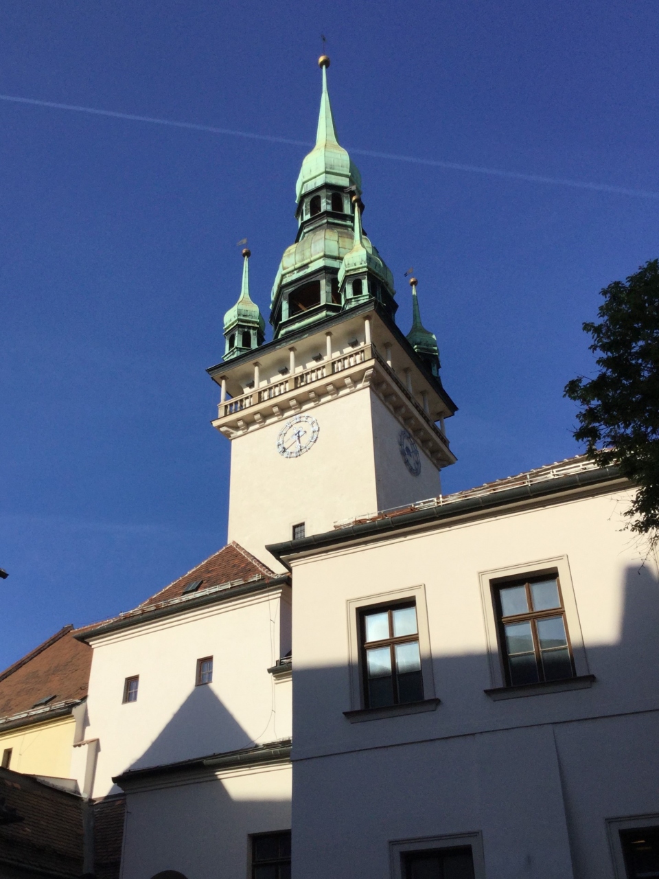 旧市庁舎は旧市街の緑の市場のすぐ北側にあり高さ63mの時計塔が目印です。ファサードの装飾の小尖塔が曲がっているのは、製作者の報復という逸話もあり面白いです。時計塔の下をくぐるとブルノ伝説のドラゴンと車輪がありますが、ドラゴンと言っても明らかにワニでした。夏には有料で塔に登れるそうです。