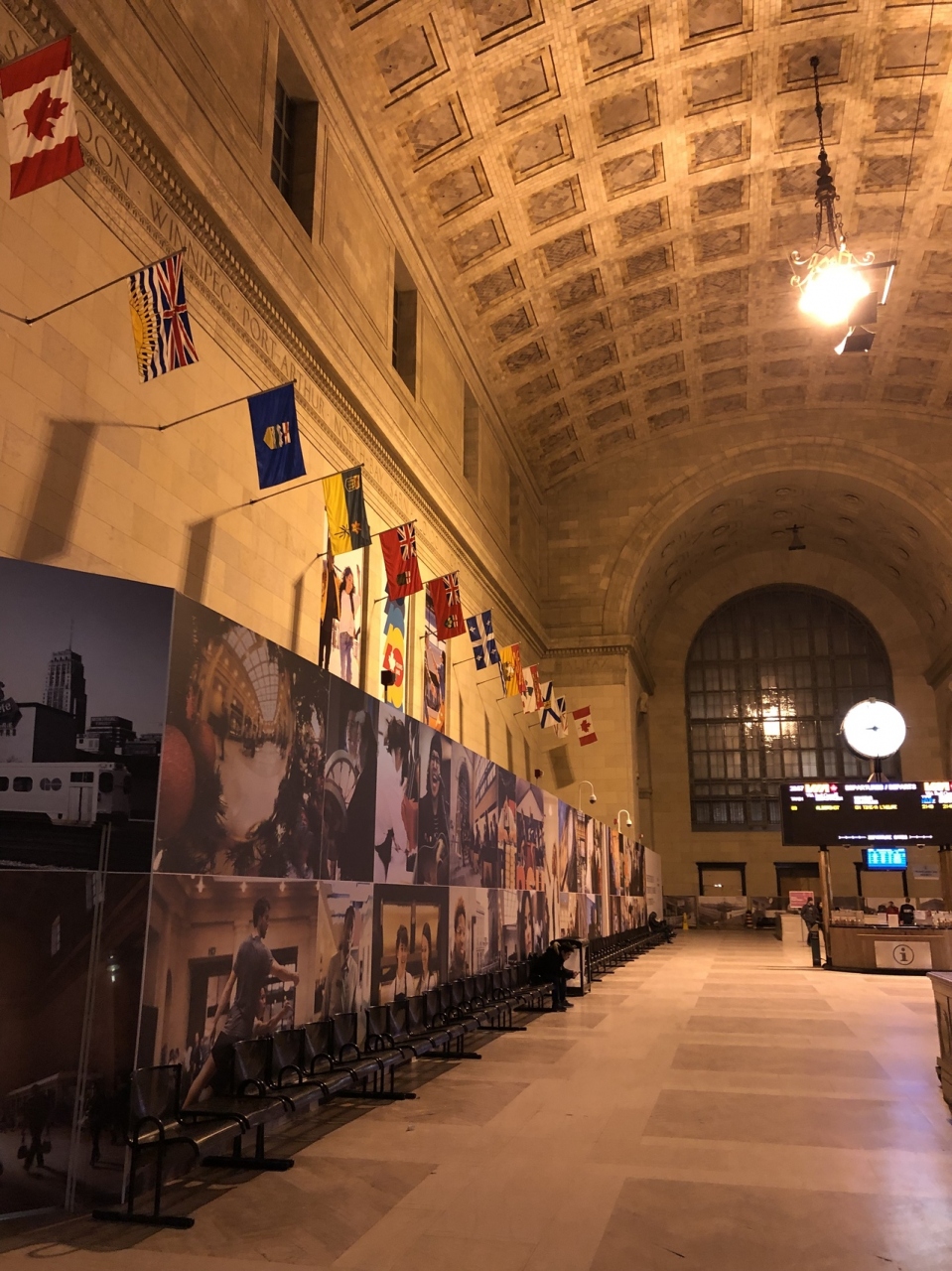 UP trainの始発駅で、カナダ国鉄の駅でもあります。建物は中は中世の教会みたいになっていて、カナダ国旗、カナダの州の旗がありました。地下に行くエスカレーターがあり、地下鉄のユニオン駅と繋がっていました。