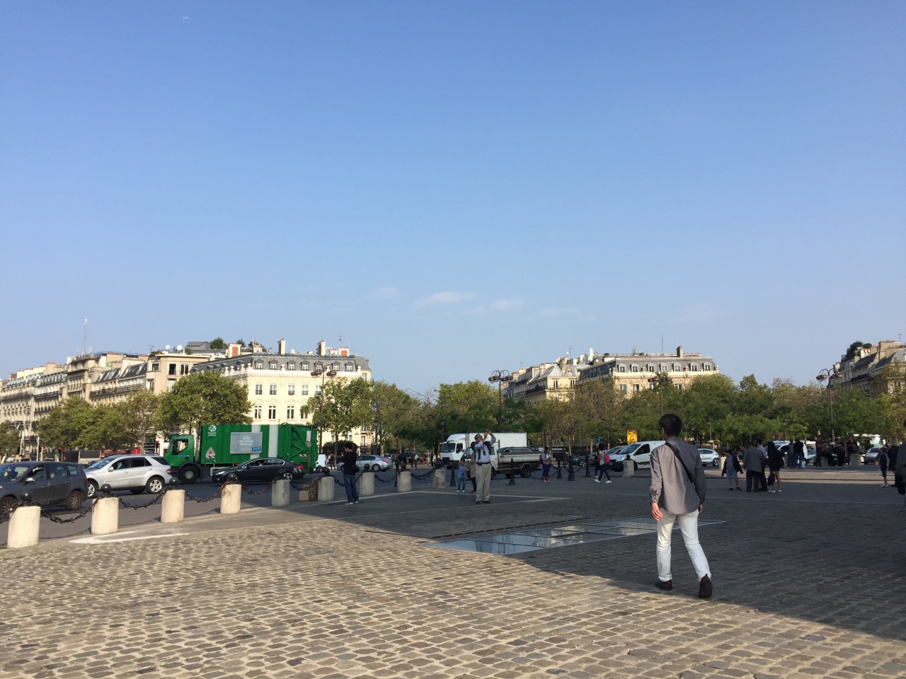 コンコルド広場を見学して、テクテクとシャンゼリゼ大通りをあるって凱旋門へ行きました。シャンゼリゼ大通りは百貨店や有名ブランドのショップがズラッとならんでいて、おしゃれな空間。どこのお店の前には黒人の警備員が立っていて、日本とは違う景色を見ることができた。コンコルド広場から大通りに抜ける前での道の変化が面白い。