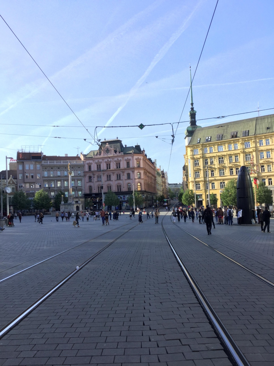 旧市街の中心にあるブルノで一番大きな広場です。広場のほぼ中央に黒い花崗岩でつくられた銃弾のような形をした天文時計があり観光客が集まっています。広場のほぼ中央をトラムが通りますが頻繁ではないようでした。広場を眺めて過ごすよりはショッピングのついでに立ち寄るくらいで良さそうです。