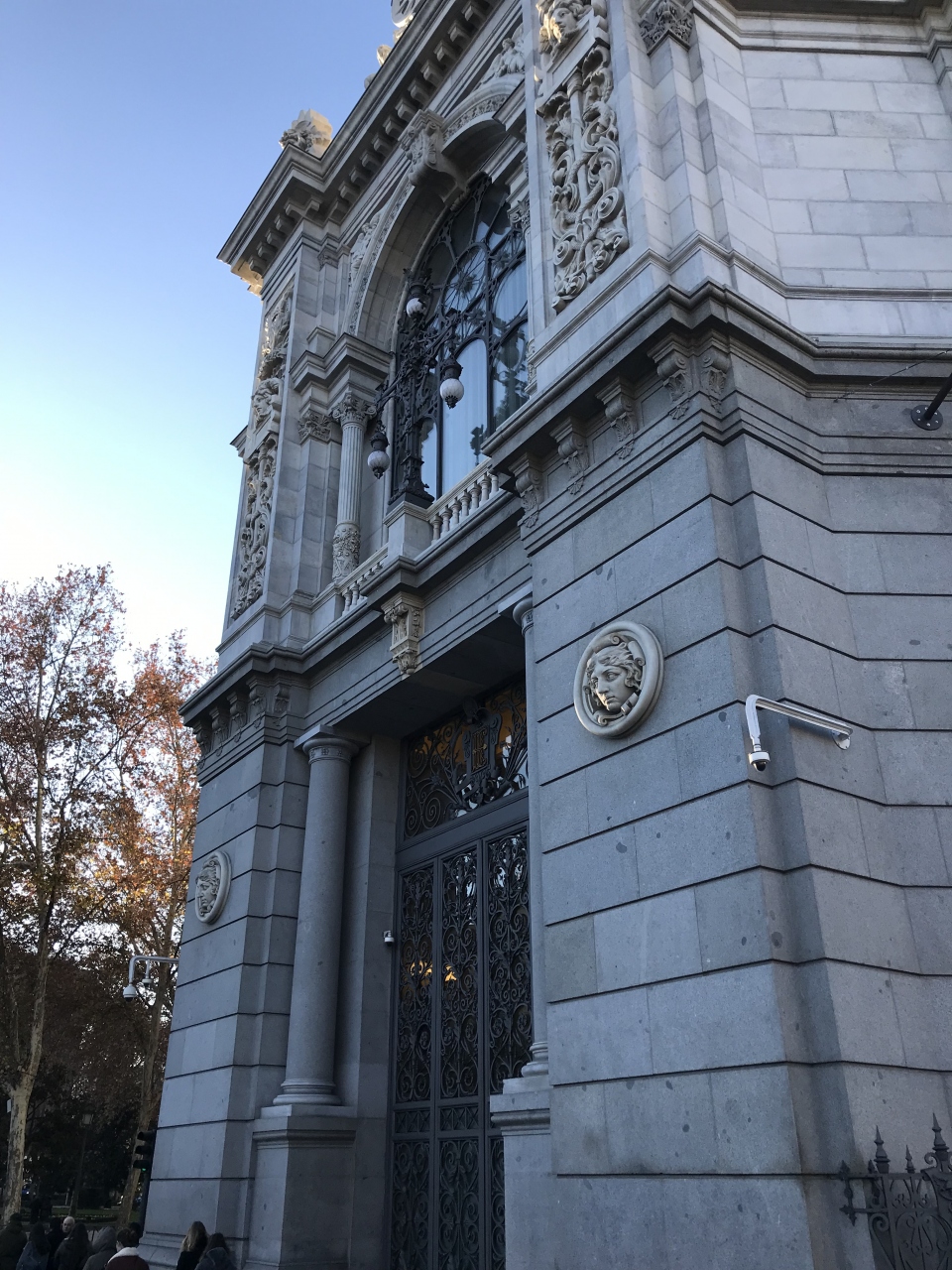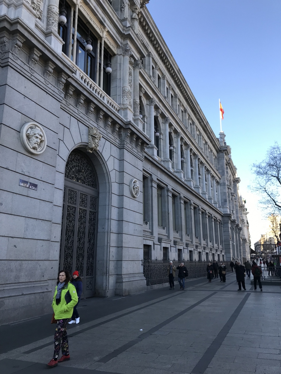 シベーレス広場の南西に建っている建物がスペイン銀行です。スペイン国旗がたなびいていました。中に入ることはできないので、外から見ただけでしたが、正面のシベーレス宮殿と比較しても引けを取らない立派な建物でした。物々しい警備が敷かれていました。