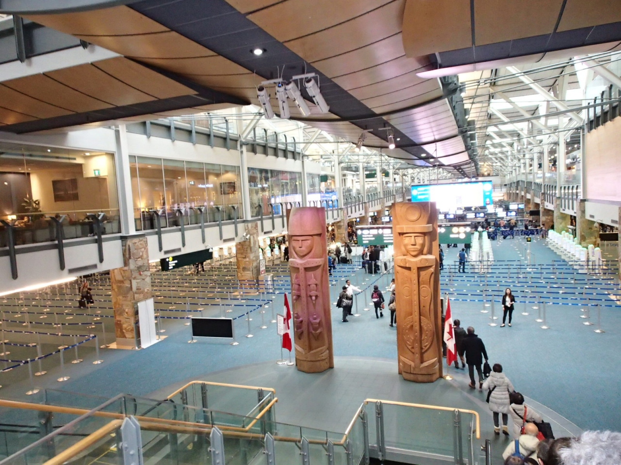 到着ロビーでは、大きな滝と、カナダらしいトーテムポールが迎えてくれます。入国審査はコンピュータ端末でパスポートと顔写真を登録するタイプで、スタンプはありませんでした。ゲートを出てすぐ外に、インフォメーションとATMがあります。