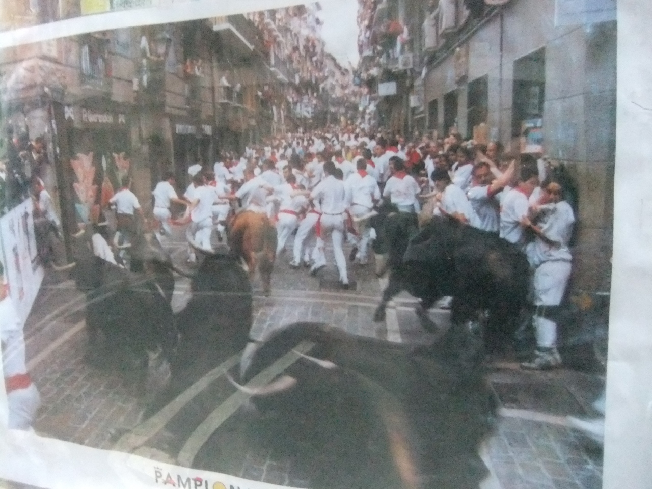 牛追いのコースは、旧市街のすごく狭い通りです。 あの勢いでこの通りを走り、角を曲がっていくと思うと、恐ろしくなります。 その上、観光客も多いとなる大混乱なのも予想出来ます。 「へミングウェイ」はこの祭りをとても気に入り、コース上にあるホテルに滞在し、見学していたそうです。