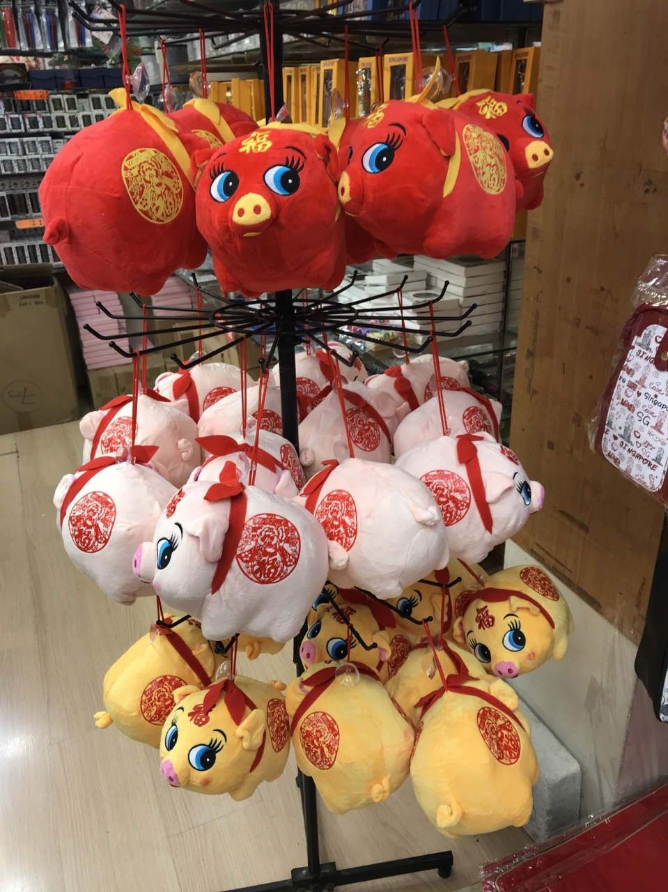 豚の飾り付けが多く売っていて、初めは豚が縁起物なのかなと思ってみていましたが、鼠、牛、虎、、、、のならびの最後にぶたの絵が描かれていたので日本ではイノシシが中国ではぶたなんだろうという結論に。