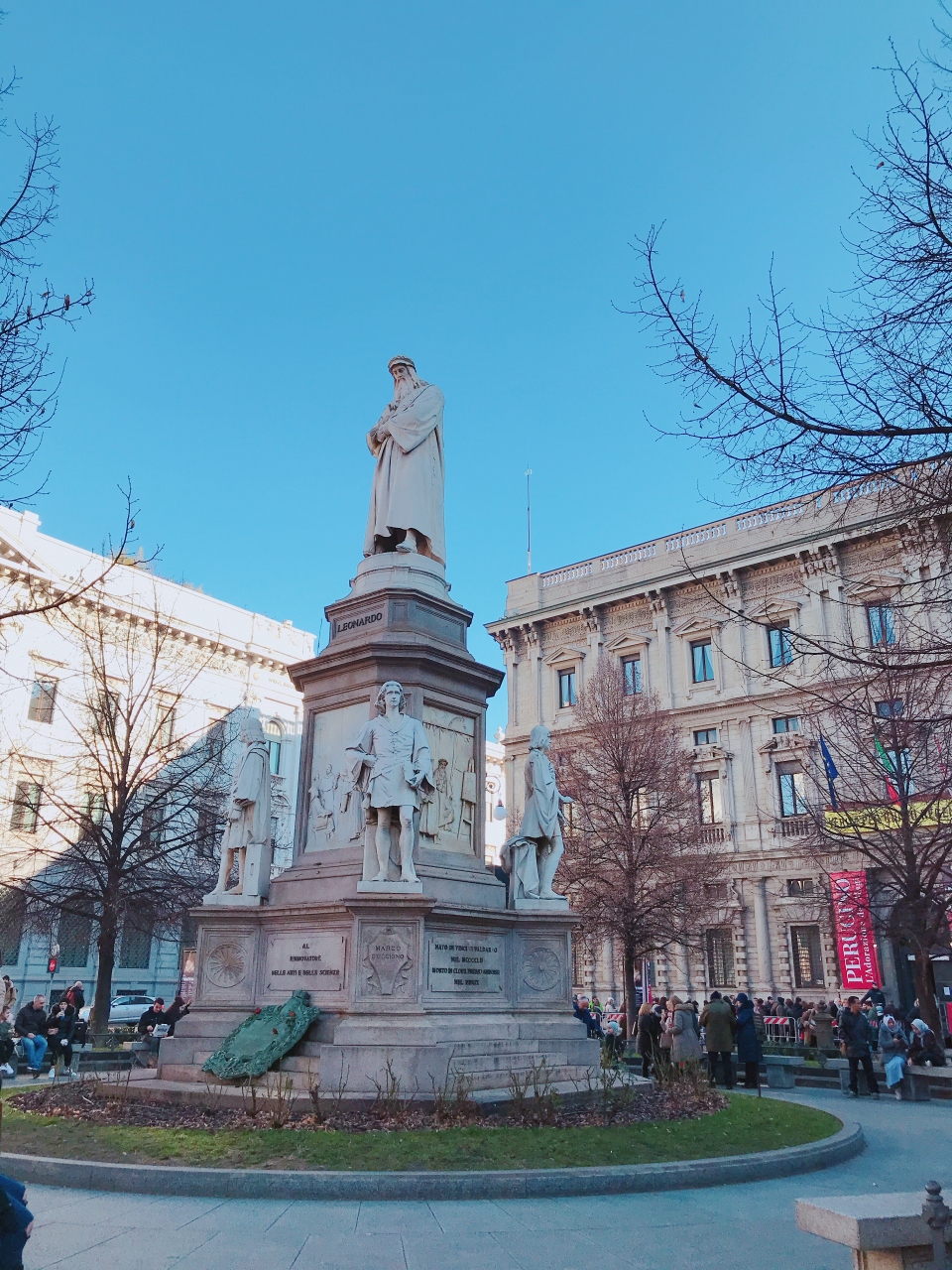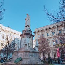 スカラ座前にある広場です。ここの名物はなんといっても銅像ですね。だれのかというとダ・ヴィンチです。それを囲むのがお弟子さんたちですね。なんともゴージャスな雰囲気です。ミラノとダ・ヴィンチは蜜月関係ですもんね。