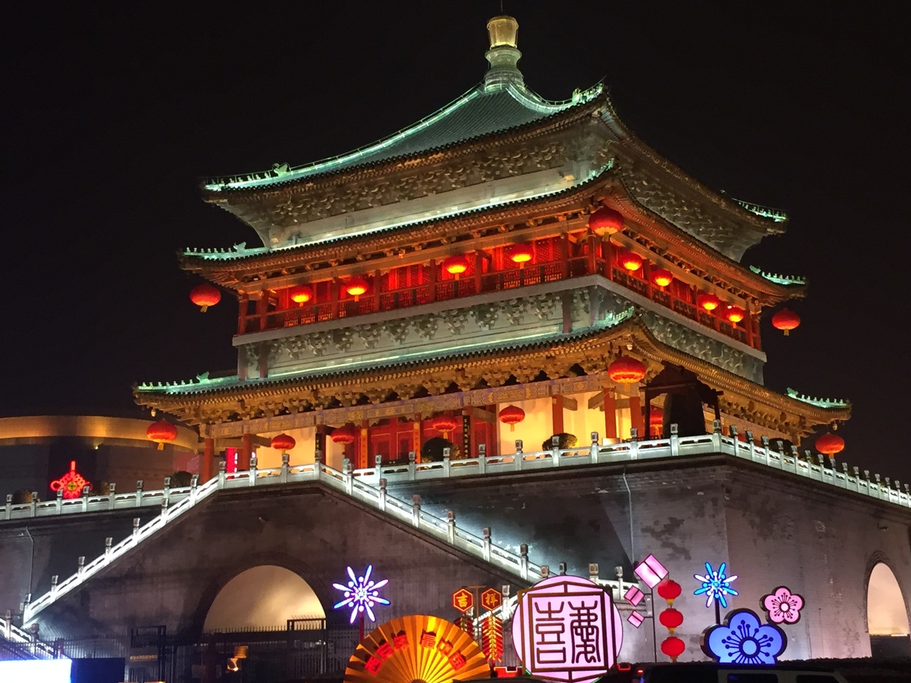 地下鉄駅と繋がっているランドマーク的建築物。回民街へも徒歩数分です。鐘楼周辺の道は車しか通れませんので、鐘楼を見学するには、地下道を通ってチケットを購入してから上がります。夜はきれいにライトアップされて、中国の雰囲気が感じられます。