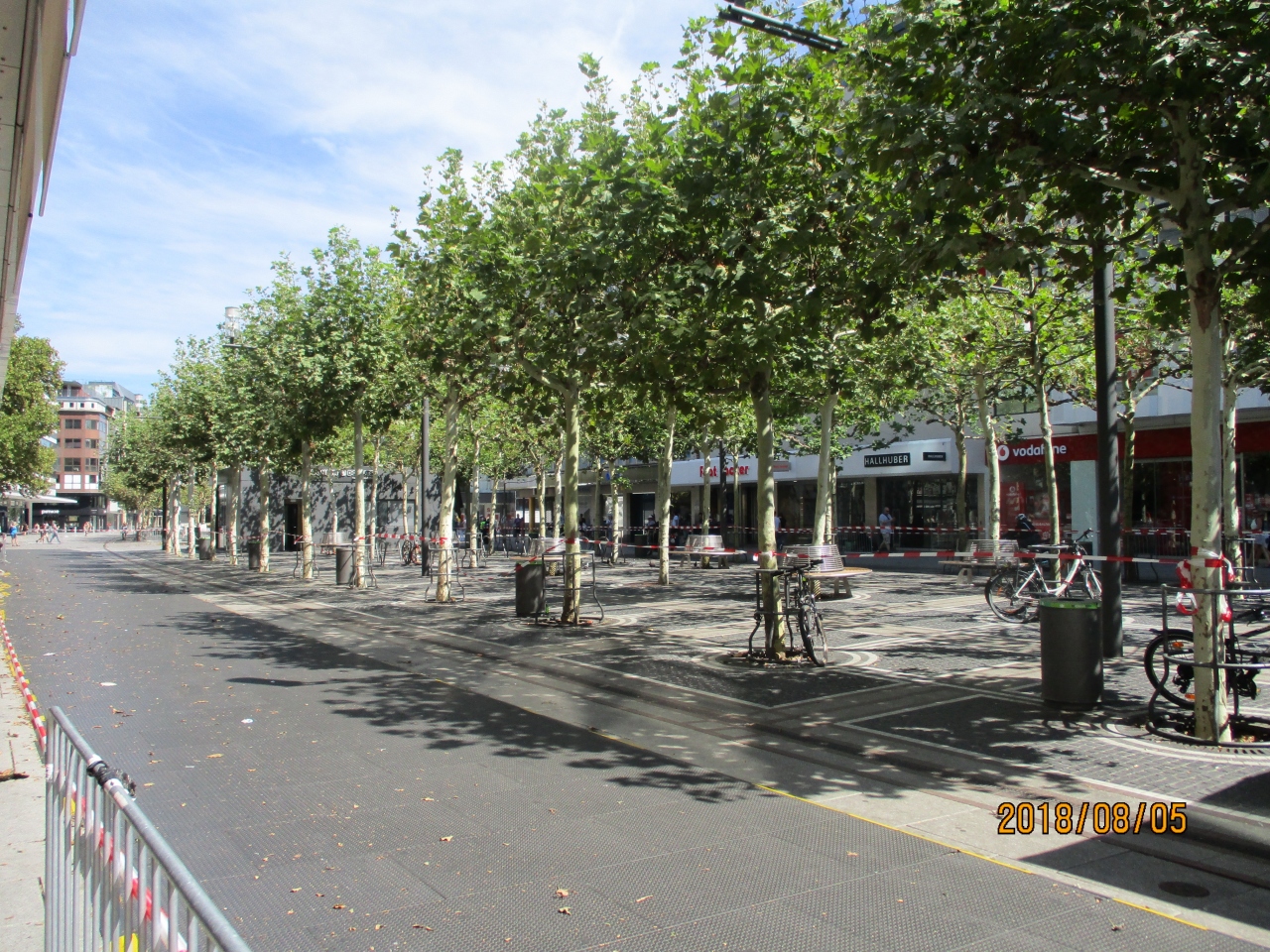 フランクフルト有数の観光スポット「ハウフトヴァッフェ」から東へ延びる通りです。デパート「ガレリア」や、ショッピングセンター「マイツァイル」に面し、通りの両側には、色々なショップが並び、買い物客でにぎわっています。今回訪れたときは、シティトライアスロン(?)の競技が行われ、沿道は見物人などでこみあっていました。