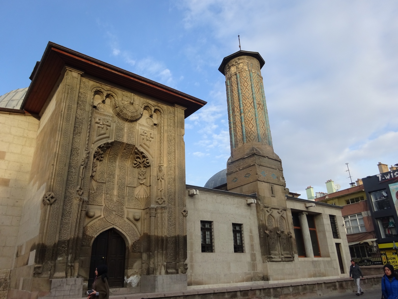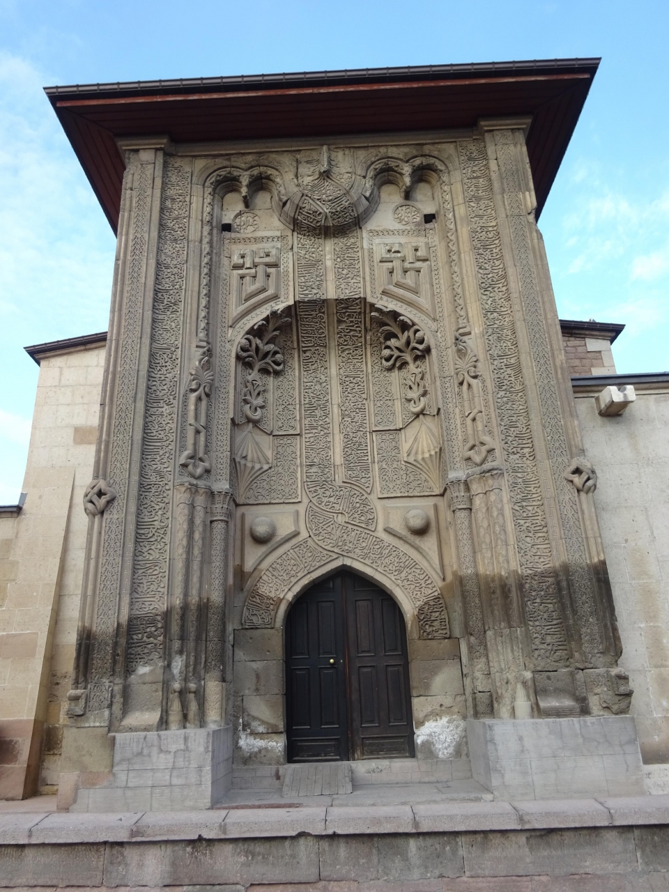 1267年にイスラム教の神学校として設立されたイエンジェミール神学校。 細い(=インジェ)尖塔(=ミナーレ)という意味で、尖塔は現在落雷によって少し低くなっているのが残念でした。アラビア文字や幾何学模様の浮き彫りがとても美しく、門の脇にあるミナーレの壁面装飾が素晴らしかった。新学校の入り口の彫刻も素晴らしかったです。